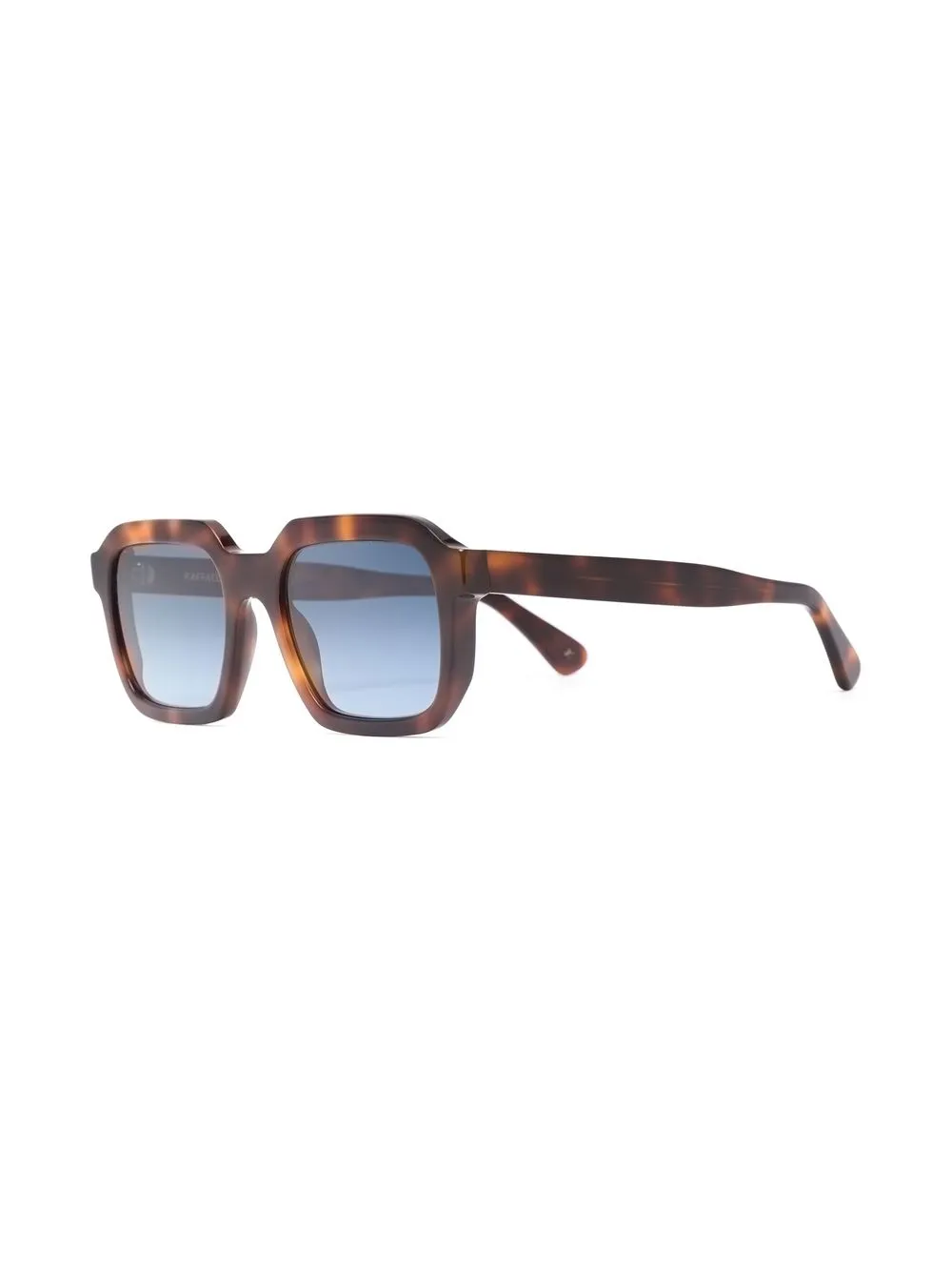 Bruin, acetaat, blauwe glazen, schildpad montuur, rechthoekig montuur, rechte pootjes en gebogen uiteinde. Deze bril wordt verkocht met een beschermhoes..