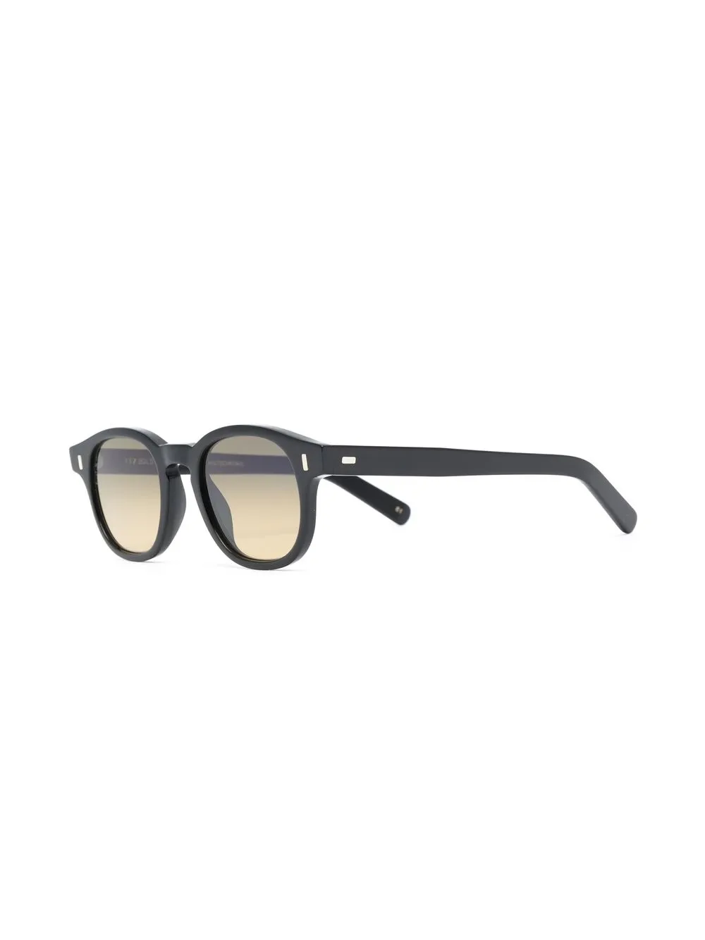 Zwart, acetaat, gekleurde glazen, rond montuur, rechte pootjes en gebogen uiteinde. Deze bril wordt verkocht met een beschermhoes..