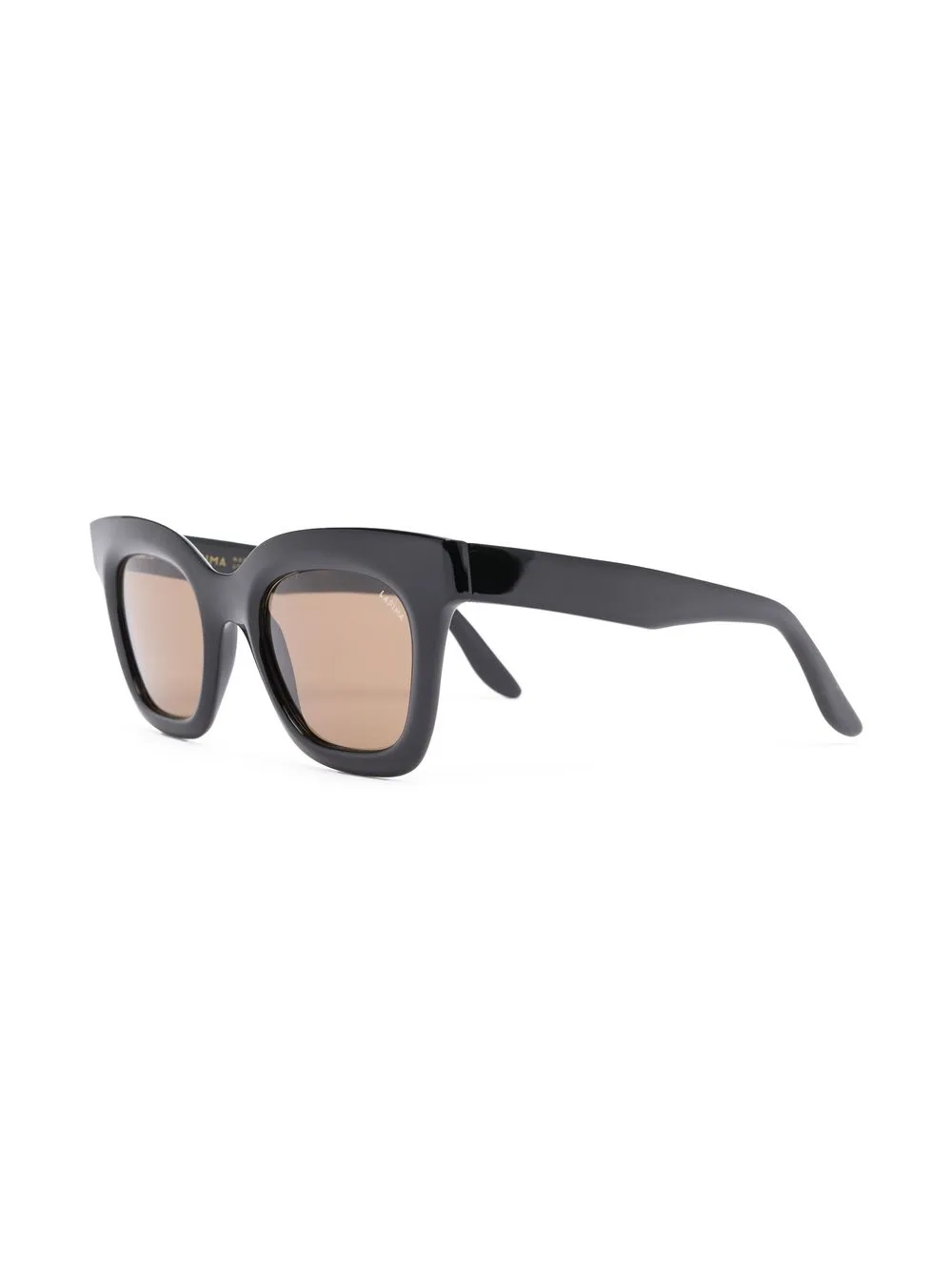 Zwart, acetaat, gekleurde glazen, vierkant montuur en rechte pootjes. Deze bril wordt verkocht met een beschermhoes..