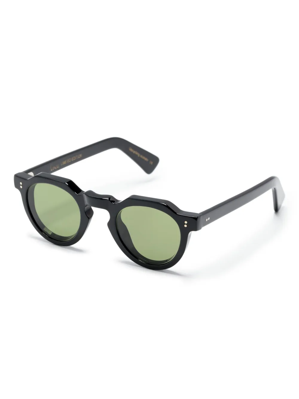 Zwart, gerecycled acetaat, rond montuur, groengetinte glazen, glazen met UV-bescherming, logo aan binnenkant, stud-details, rechte pootjes en rechte afwerking.