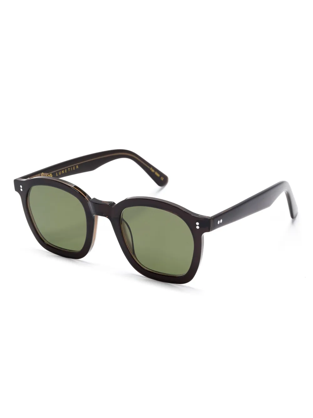 donkerbruin vierkant montuur groen getinte glazen glazen met UV-bescherming rechte pootjes gebogen uiteinden Deze bril wordt verkocht met een beschermhoes.