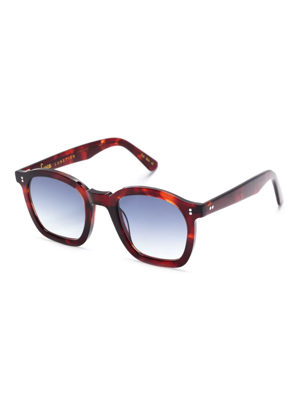 medium bruin acetaat schildpad montuur vierkant montuur blauwe glazen met kleurverloop neuskussentjes rechte pootjes gebogen uiteinden Deze bril wordt verkocht met een beschermhoes.