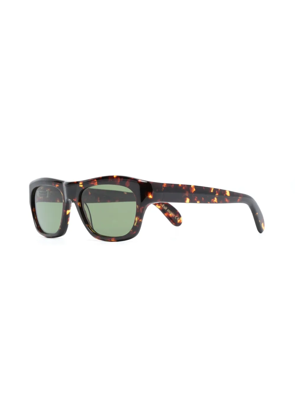Bruin, acetaat, schildpad montuur, groengetinte glazen, oversized pootjes en gebogen uiteinde.