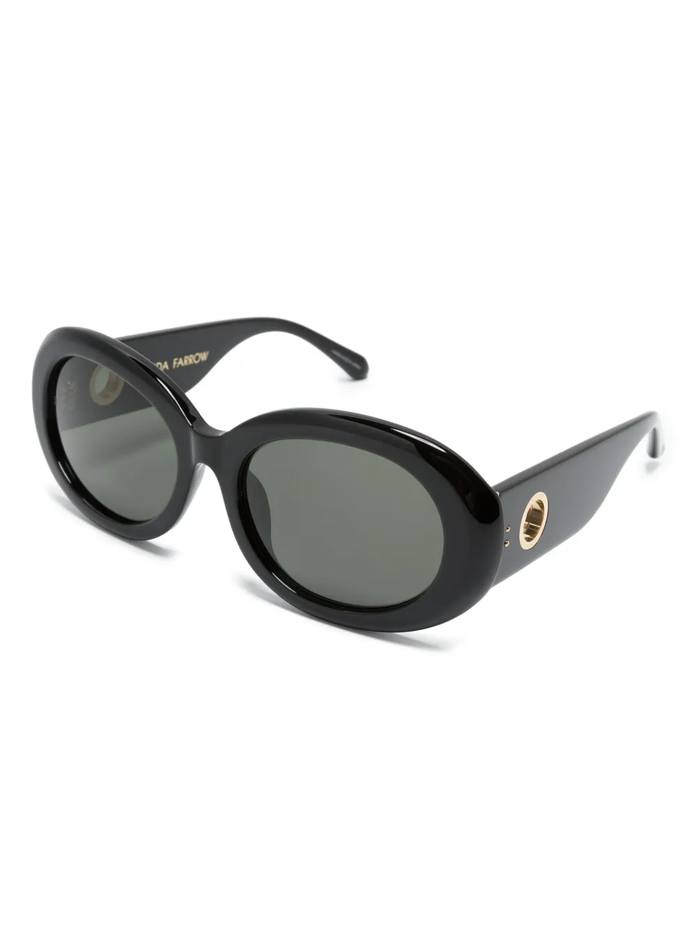 zwart acetaat ovaal montuur grijze glazen glazen met UV-bescherming logo lens sticker zilverkleurige hardware met gegraveerd logo op de poot goudkleurige uitgesneden details op de poten oversized poten en gewelfde uiteinden Deze bril wordt verkocht met een beschermhoes.