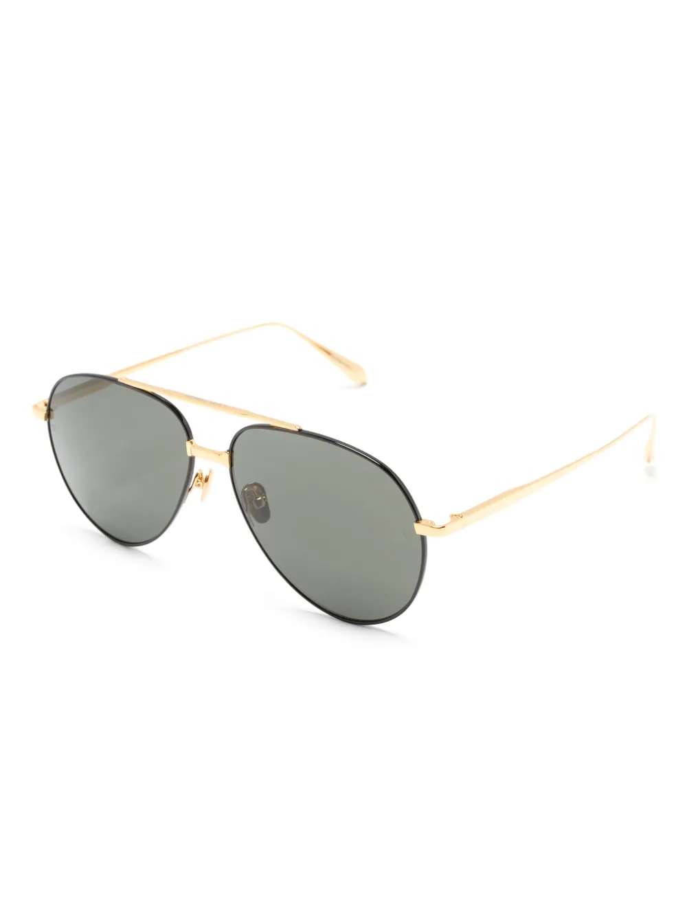 goudkleurig metaal piloten montuur gekleurde glazen lens sticker metalen staaf bij de wenkbrauwen neuskussentjes rechte pootjes gebogen uiteinde Deze bril wordt verkocht met een beschermhoes.