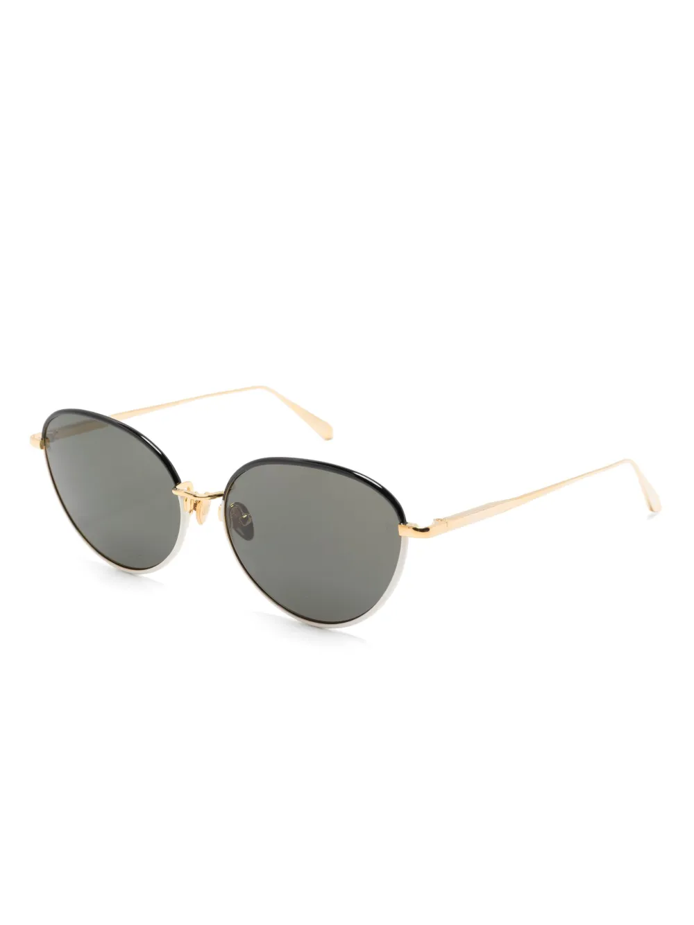 zwart/wit/goudkleurig titanium cat-eye montuur gekleurde glazen neuskussentjes rechte pootjes gebogen uiteinden Deze bril wordt verkocht met een beschermhoes.