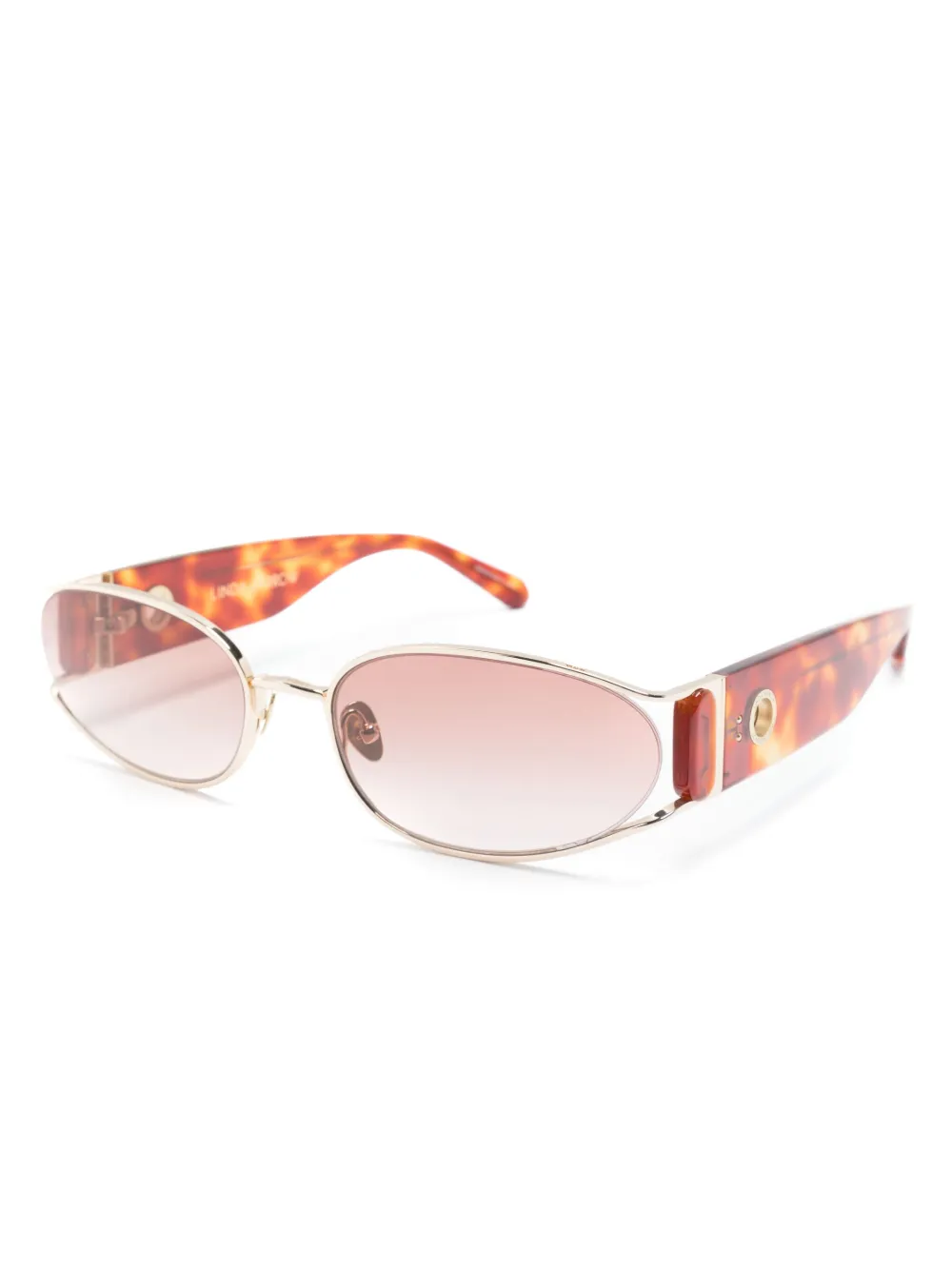 Bruin, acetaat, glazen met kleurverloop, ovaal montuur, pootje met gegraveerd logo, neuskussentjes, rechte pootjes en gebogen uiteinde. Deze bril wordt verkocht met een beschermhoes..