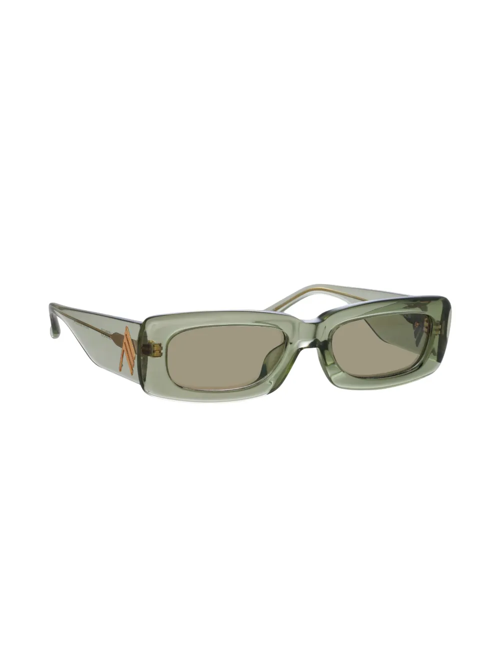 Olijfgroen, acetaat, groengetinte glazen, rechthoekig montuur, logoplakkaat op het pootje, rechte pootjes en gebogen uiteinde. Deze bril wordt verkocht met een beschermhoes..