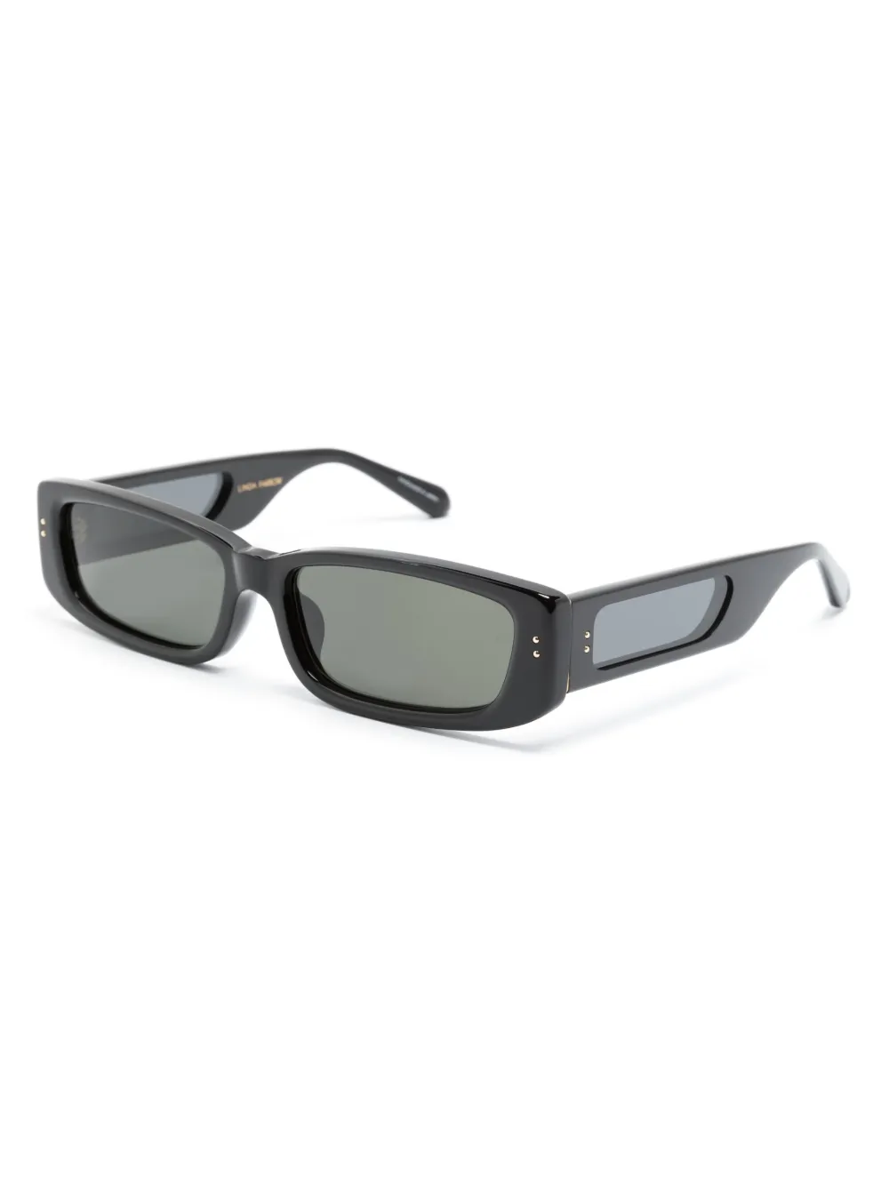 Zwart, acetaat, logo aan binnenkant, goudkleurig materiaal, rechthoekige vorm, gekleurde glazen, rechte pootjes en gebogen uiteinde. Deze bril wordt verkocht met een beschermhoes..