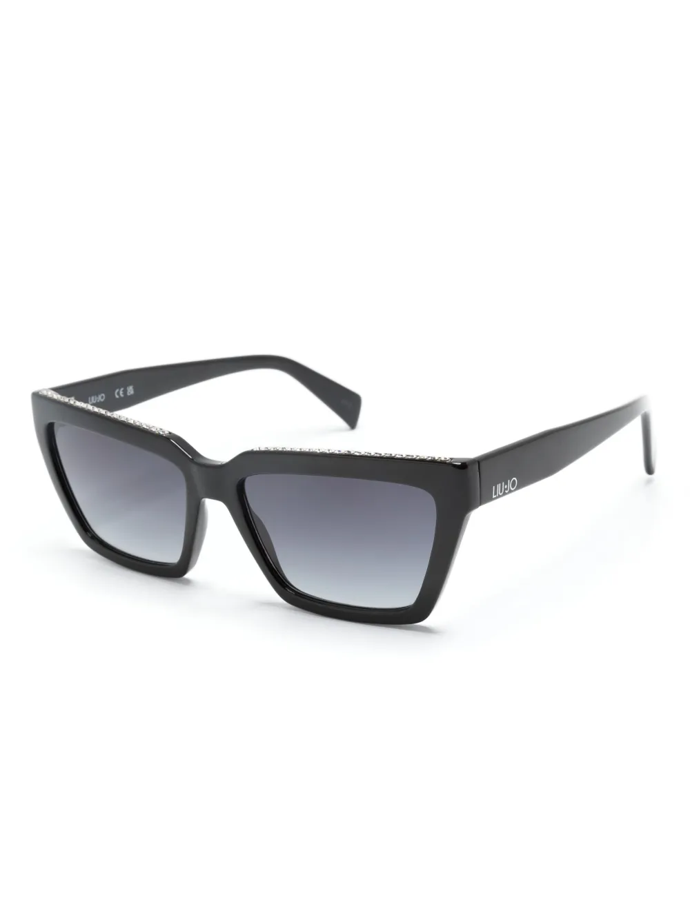 zwart acetaat verfraaid met bergkristallen vierkant montuur glazen met kleurverloop glazen met UV-bescherming pootje met gegraveerd logo bewerkte poten met gewelfde uiteinden Deze bril wordt verkocht met een beschermhoes.