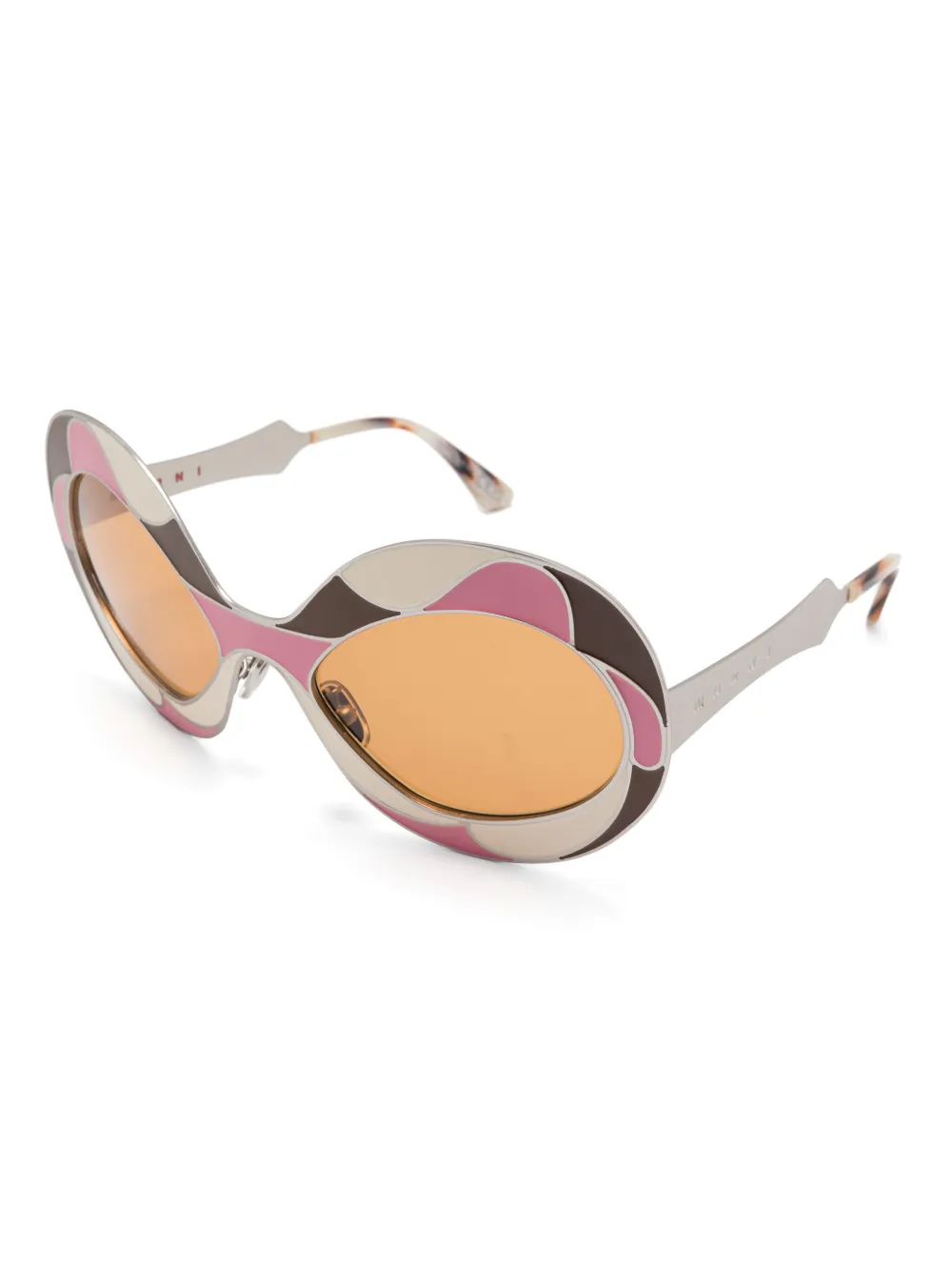 ecru/roze/bruin mozaïek details oversized montuur bruine glazen neuskussentjes geschulpte pootjes pootje met gegraveerd logo gebogen uiteinden Deze bril wordt verkocht met een beschermhoes.