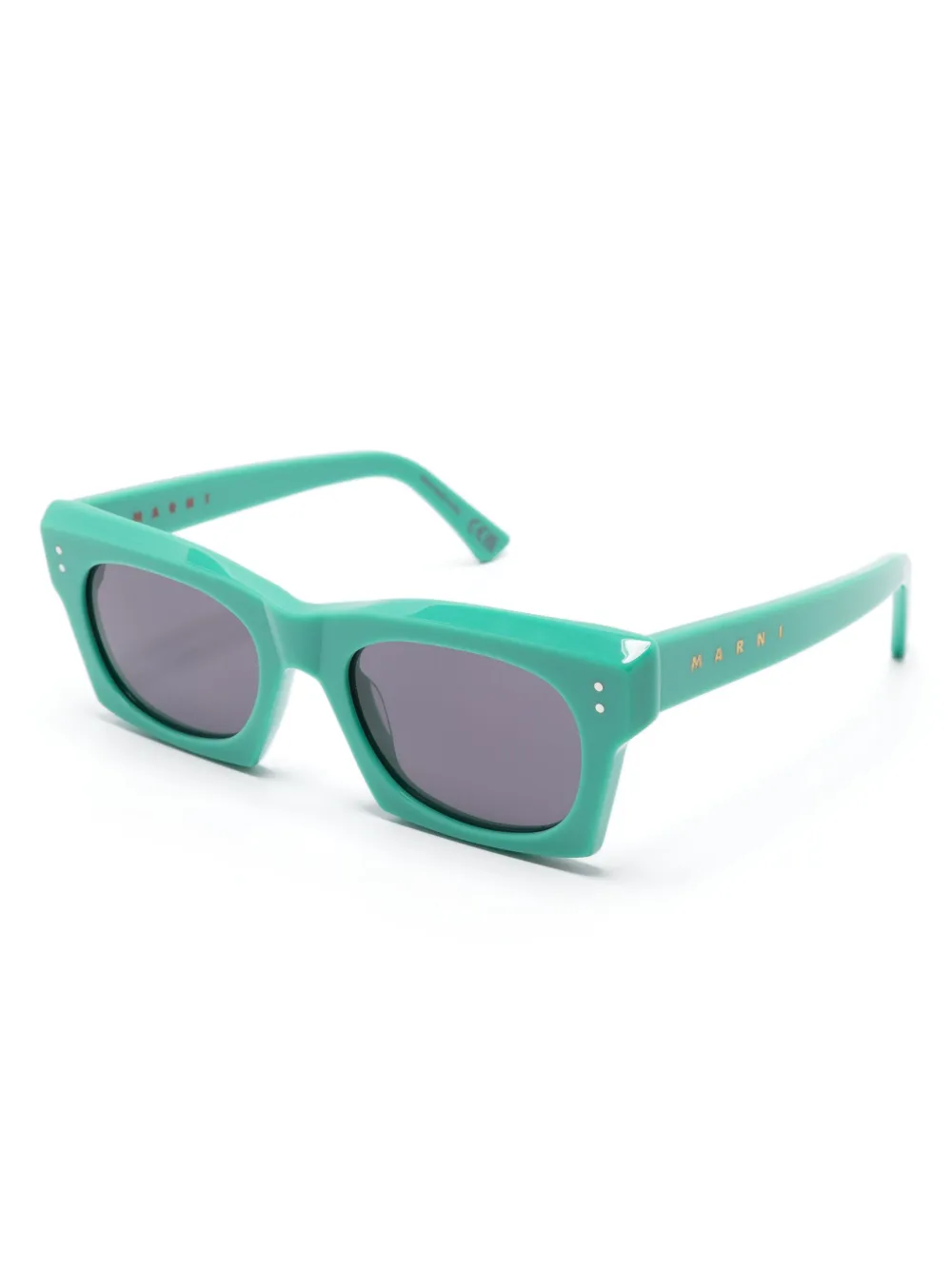 Mintgroen, acetaat, ovaal montuur, gekleurde glazen, logoprint op het pootje, rechte pootjes en gebogen uiteinde. Deze bril wordt verkocht met een beschermhoes..