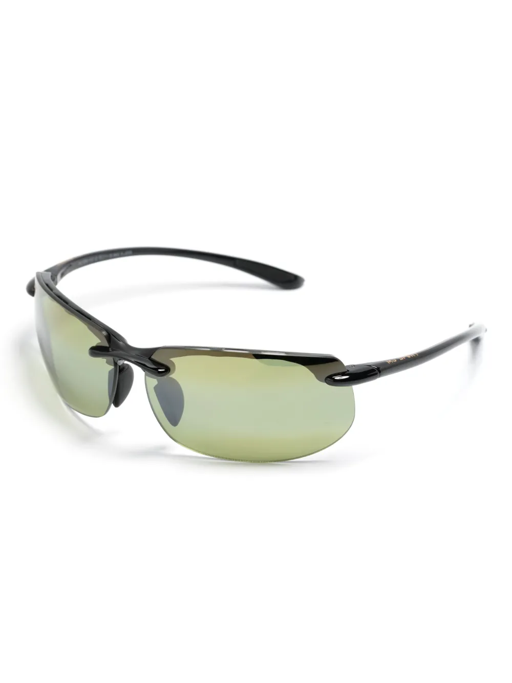 Zwart, acetaat, rechthoekige vorm, randloze glazen, polariserende glazen, neuskussentjes en gebogen uiteinde. Deze bril wordt verkocht met een beschermhoes..