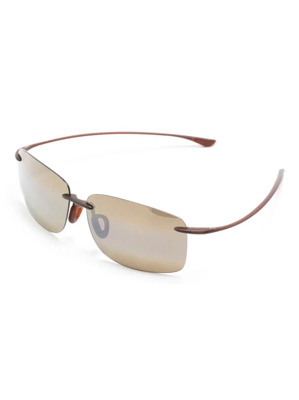 Lichtbruin, acetaat, frameloos design, glazen met dubbel kleurverloop, gewelfde pootjes en rechte afwerking. Deze bril wordt verkocht met een beschermhoes..