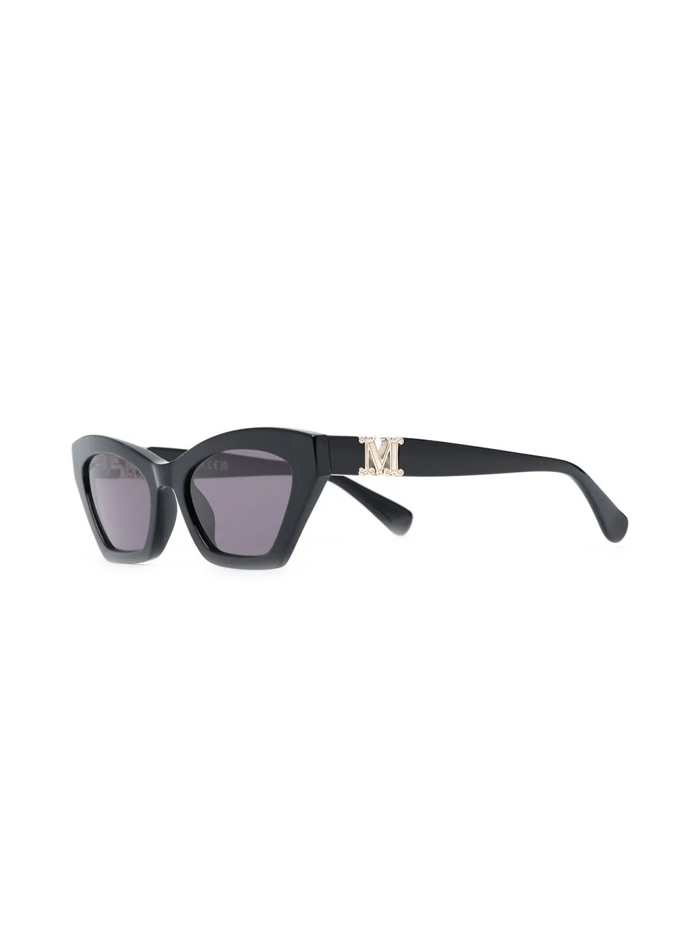Zwart, goudkleurig logo, cat-eye montuur, grijze glazen en gebogen uiteinde.