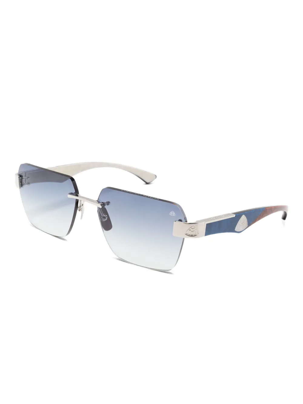 zilverkleurig randloze glazen geometrische vorm gewelfde pootjes Deze bril wordt verkocht met een beschermhoes.
