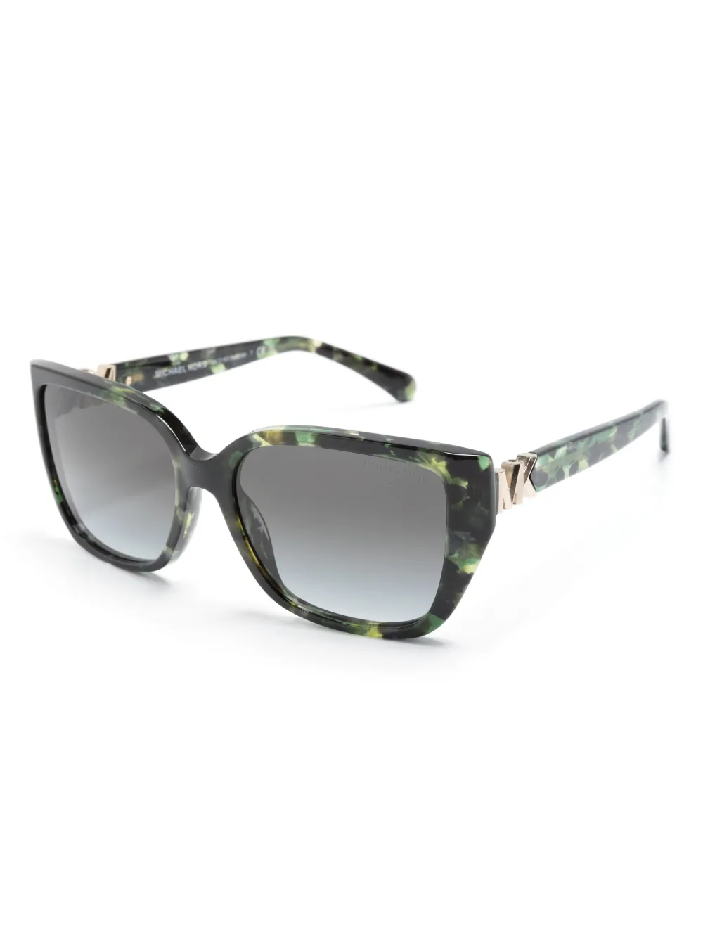 Jadegroen, donkergroen, acetaat, schildpad montuur, goudkleurig logo, glazen met kleurverloop, vierkant montuur, rechte pootjes en gebogen uiteinde. Deze bril wordt verkocht met een beschermhoes..