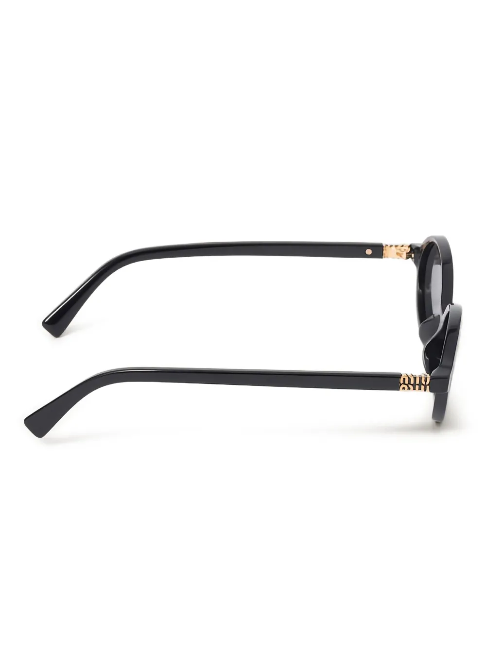 zwart rond montuur goudkleurig logodetail donkere glazen smalle pootjes Deze bril wordt verkocht met een beschermhoes.