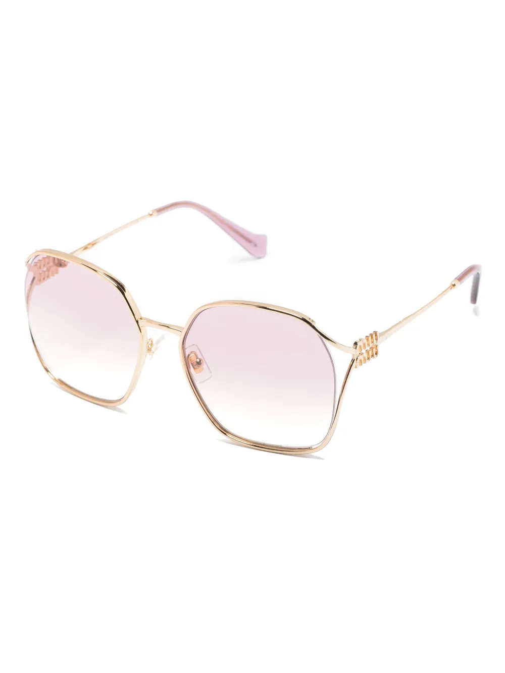 Goudkleurig, metaal, goudkleurig logo, vierkant montuur, glazen met kleurverloop, rechte pootjes en gebogen uiteinde. Deze bril wordt verkocht met een beschermhoes..
