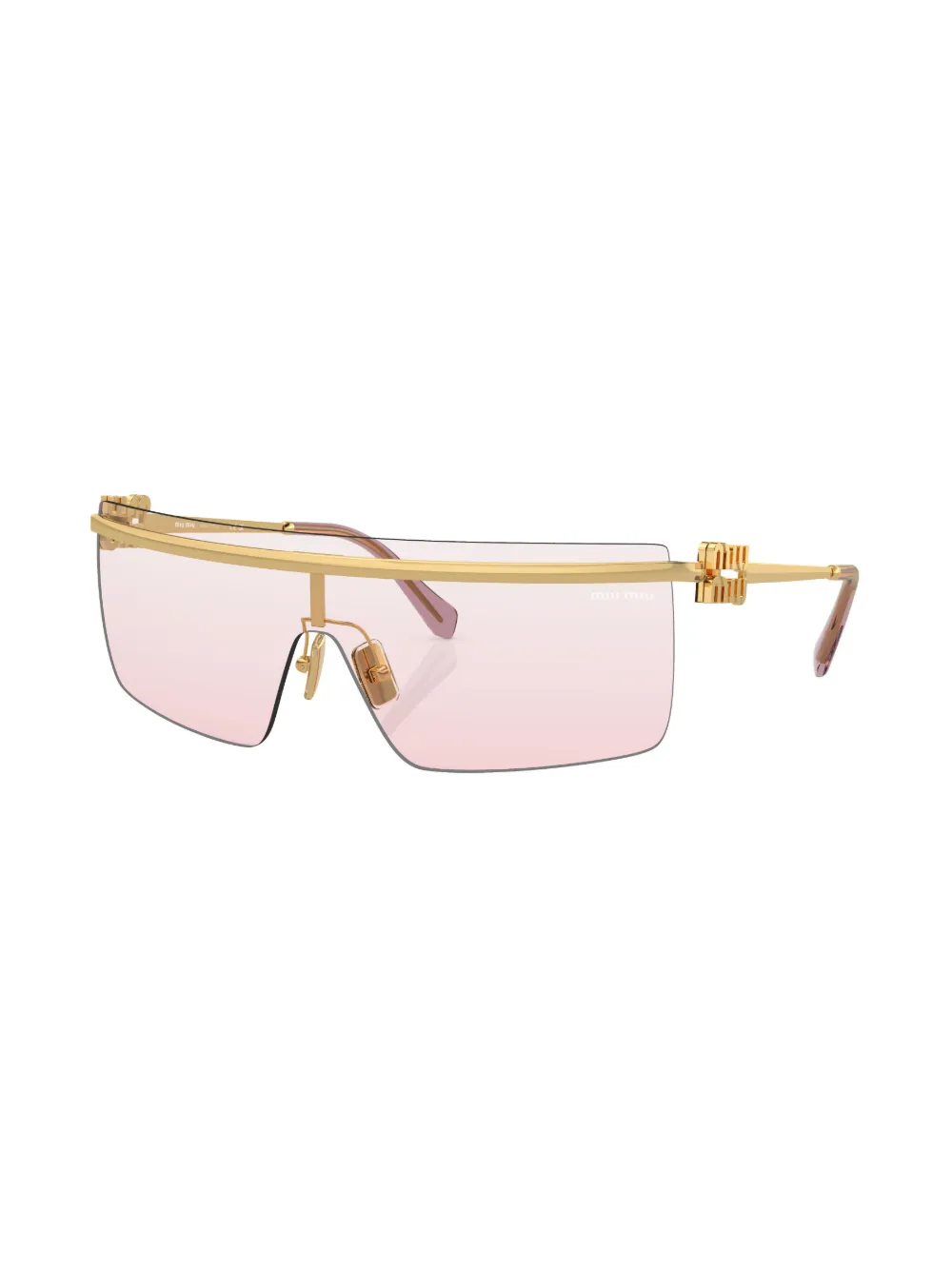 Goudkleurig, metaal, logoplakkaat op het pootje, frameloos design, randloze glazen, gekleurde glazen, metalen staaf bij de wenkbrauwen, neuskussentjes, rechte pootjes en gebogen uiteinde. Deze bril wordt verkocht met een beschermhoes..