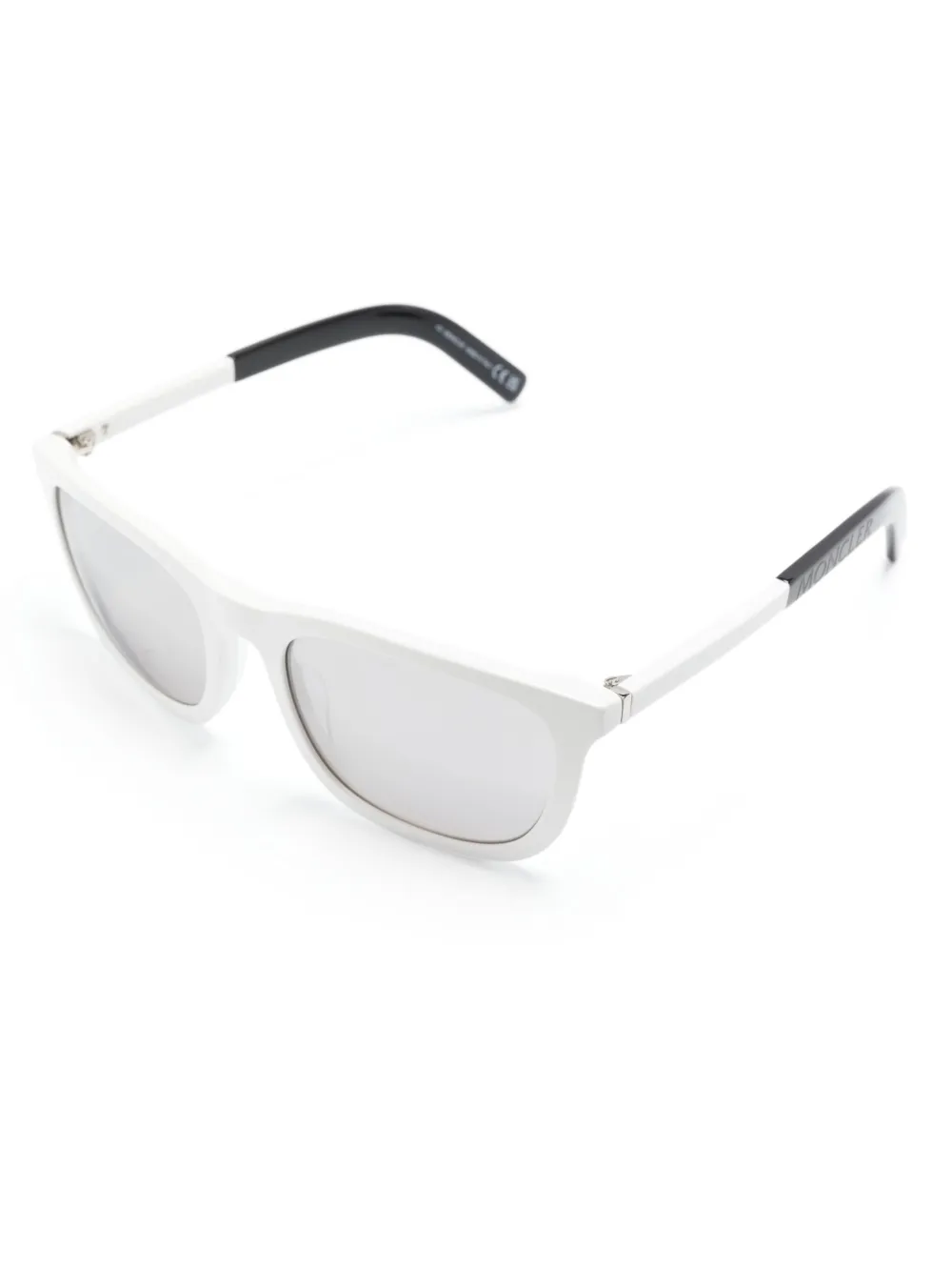 Acetaat, rechthoekig montuur, grijze glazen, glazen met UV-bescherming, lens sticker, tweekleurig design, pootje met logo-reliëf, rechte pootjes en gebogen uiteinde. Deze bril wordt verkocht met een beschermhoes..