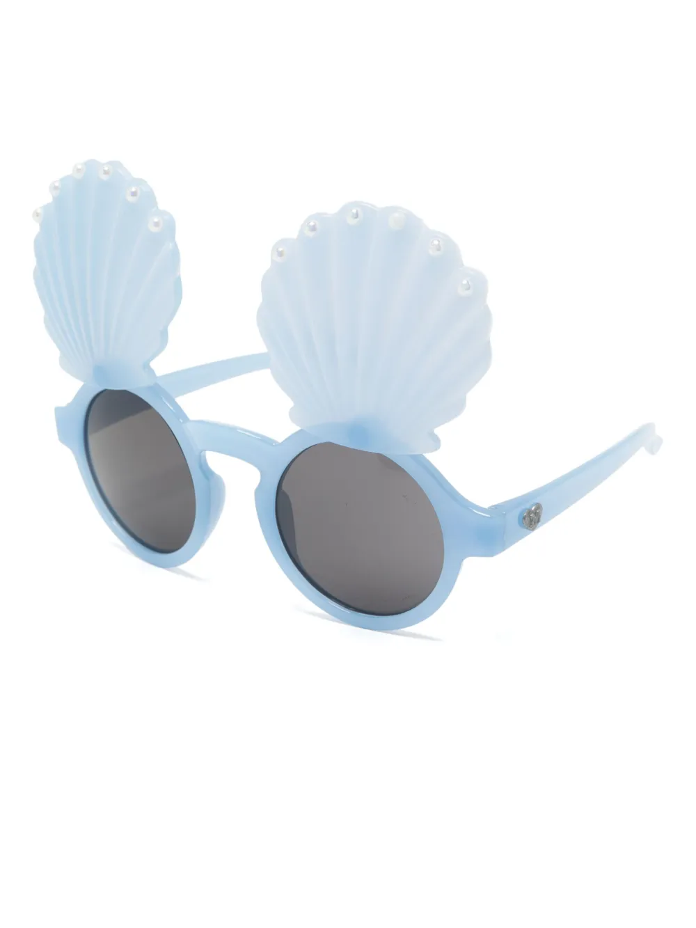 lichtblauw gelaagd design schelpen glazen verfraaid met imitatieparels rond montuur gekleurde glazen glazen met UV-bescherming rechte pootjes gebogen uiteinde Deze bril wordt verkocht met een beschermhoes.