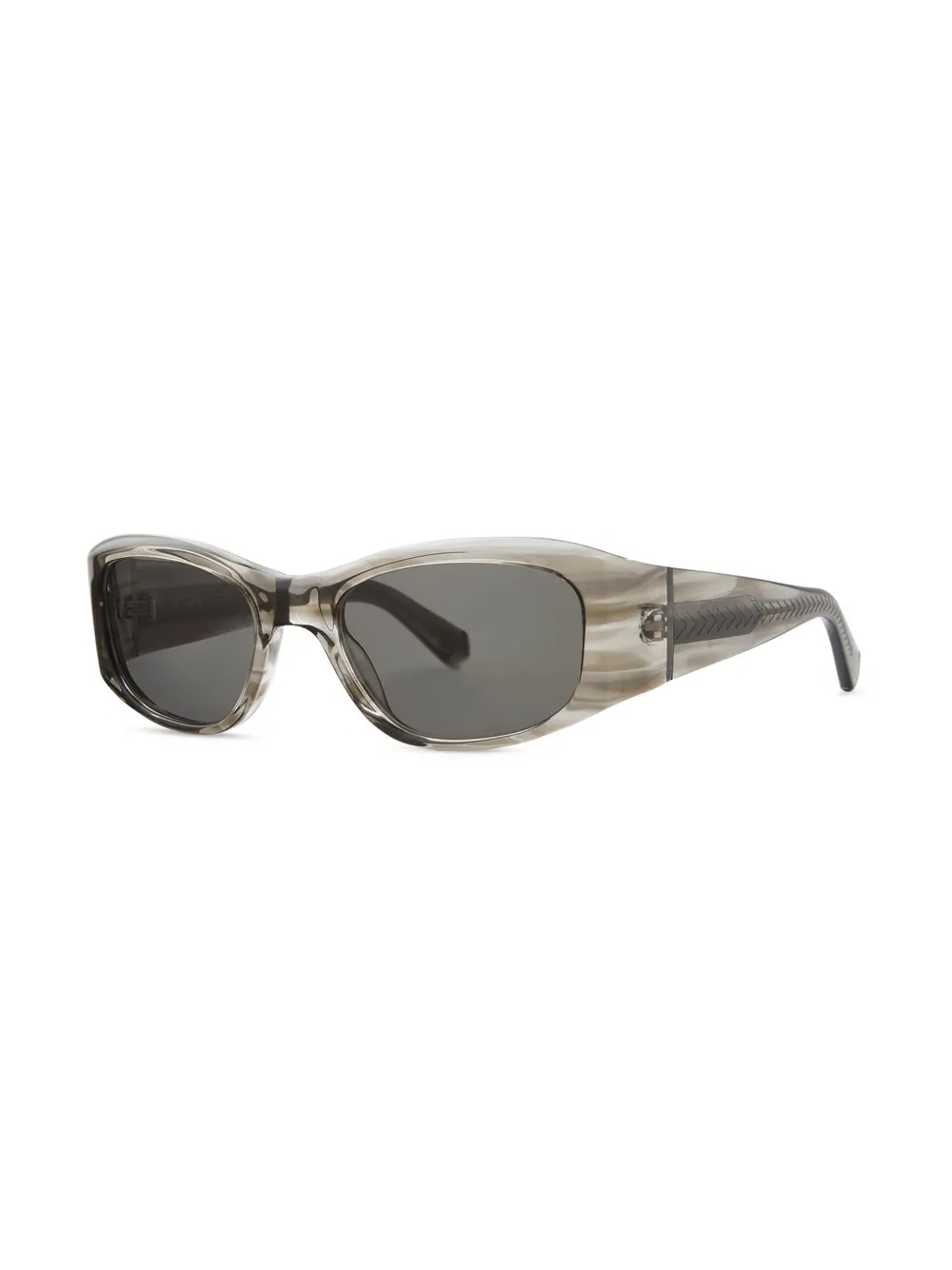 medium grijs acetaat horizontale strepen rechthoekig montuur grijze glazen rechte pootjes gebogen uiteinden Deze bril wordt verkocht met een beschermhoes.