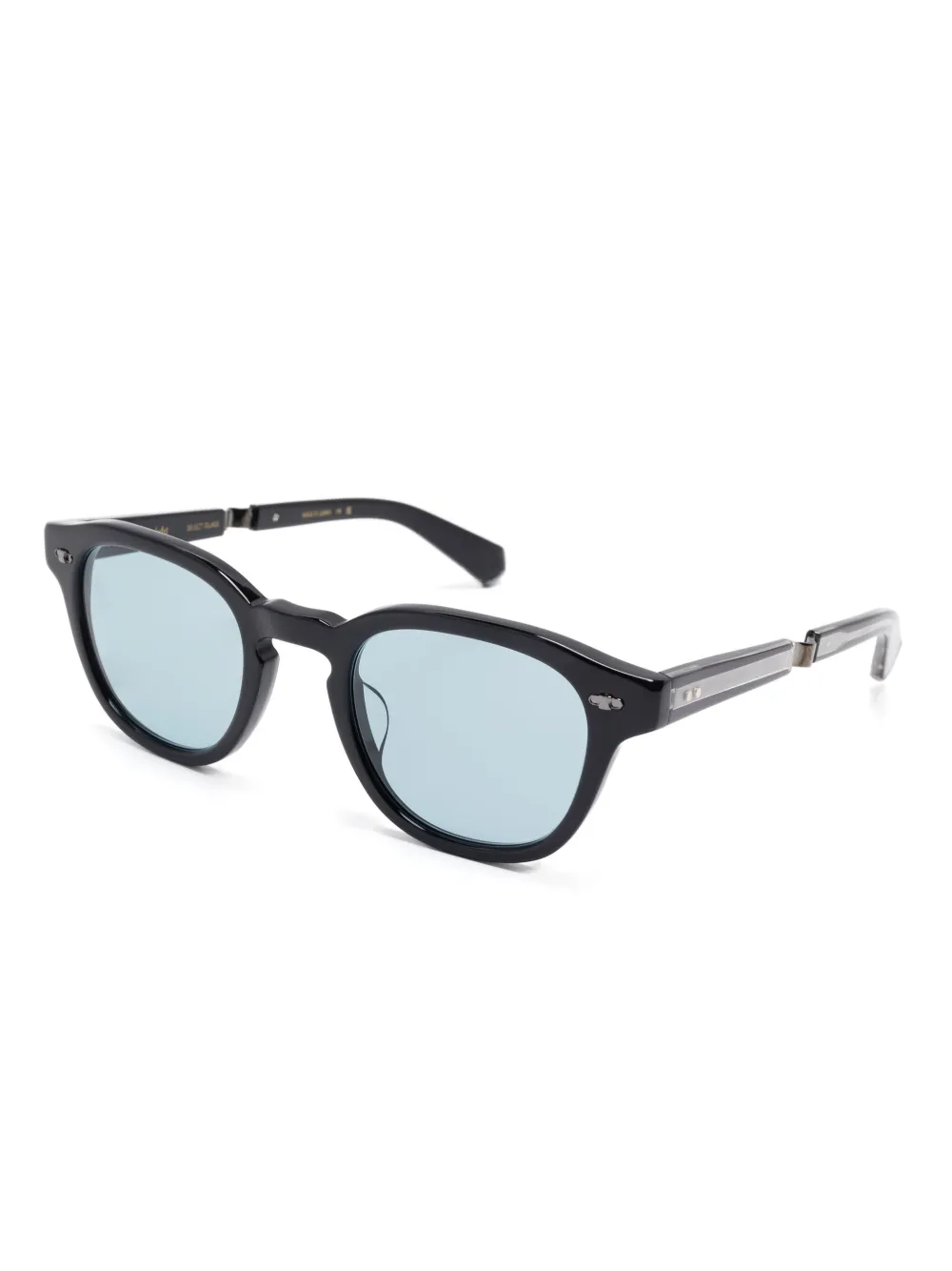 zwart blauwe glazen vierkant montuur gebogen uiteinden Deze bril wordt verkocht met een beschermhoes.