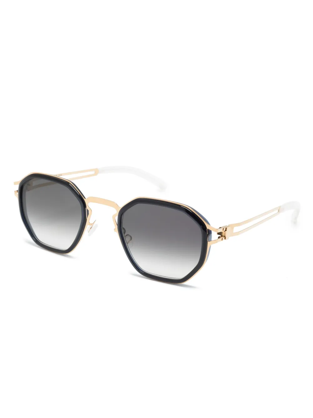 zwart/goudkleurig acetaat/titanium geometrisch montuur grijze glazen glazen met UV-bescherming neuskussentjes goudkleurige uitgesneden details op de poten rechte poten met gebogen uiteinden Deze bril wordt verkocht met een beschermhoes.