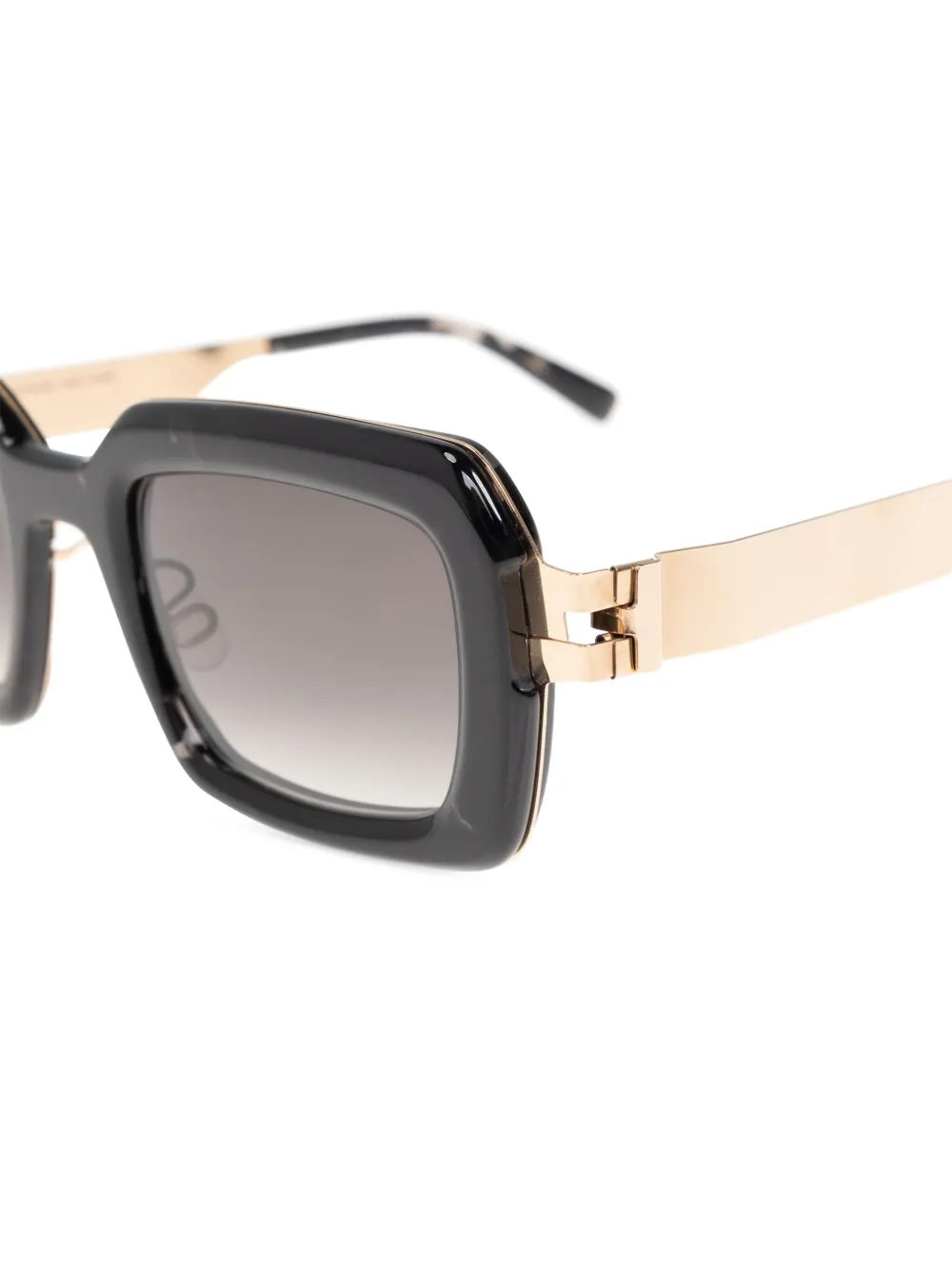 zwart glazen met kleurverloop goudkleurige details opvallende geometrische vorm detail aan de zijkant brede poten Deze bril wordt verkocht met een beschermhoes.