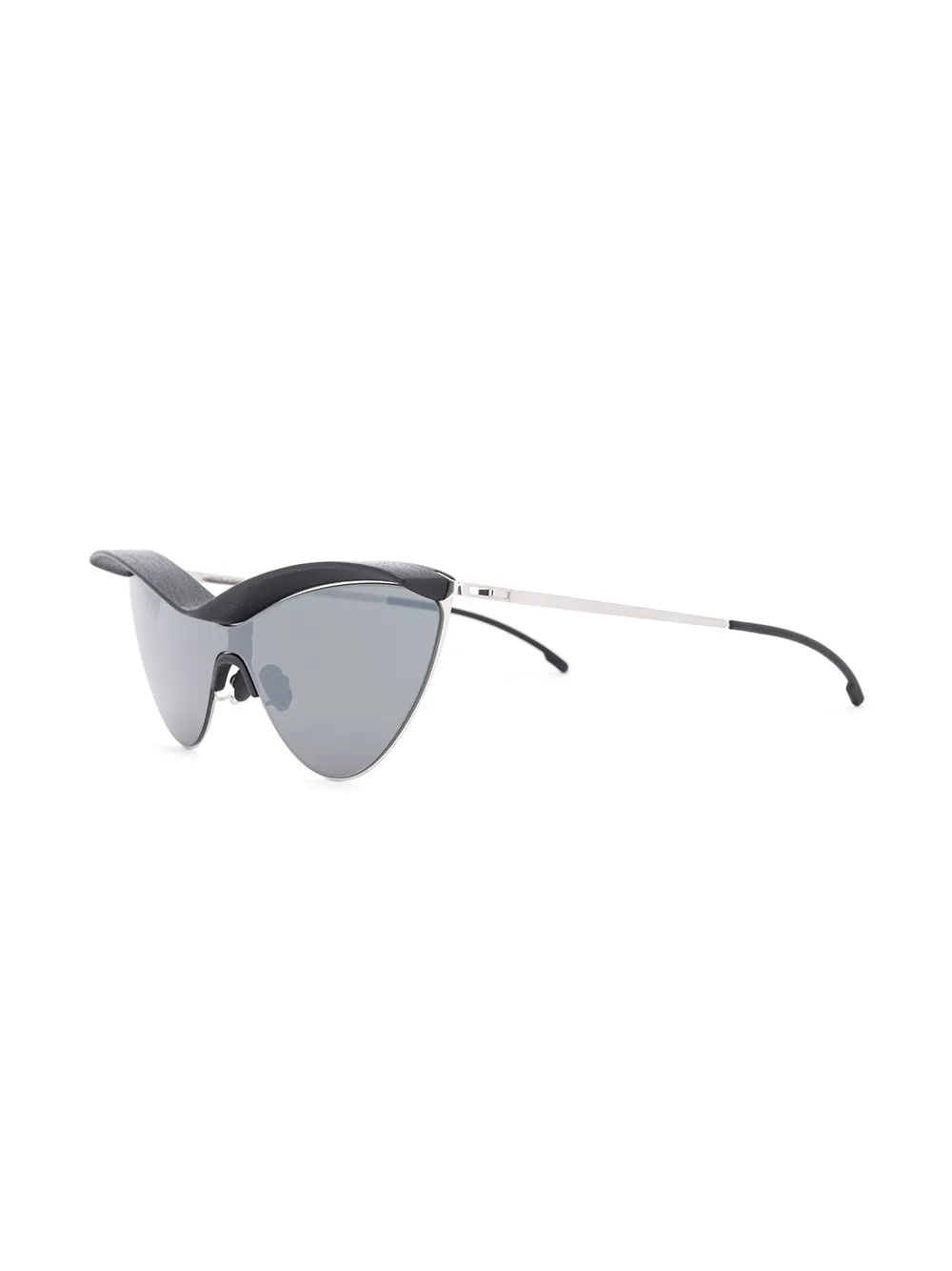Zonnebril met kattenoog montuur van Mykita uitgevoerd in acetaat voorzien van donker getinte glazen, gestrekte armen met hoekig uiteinde en logo aan de binnenkant van de armen. Het artikel is inclusief beschermende hoes.