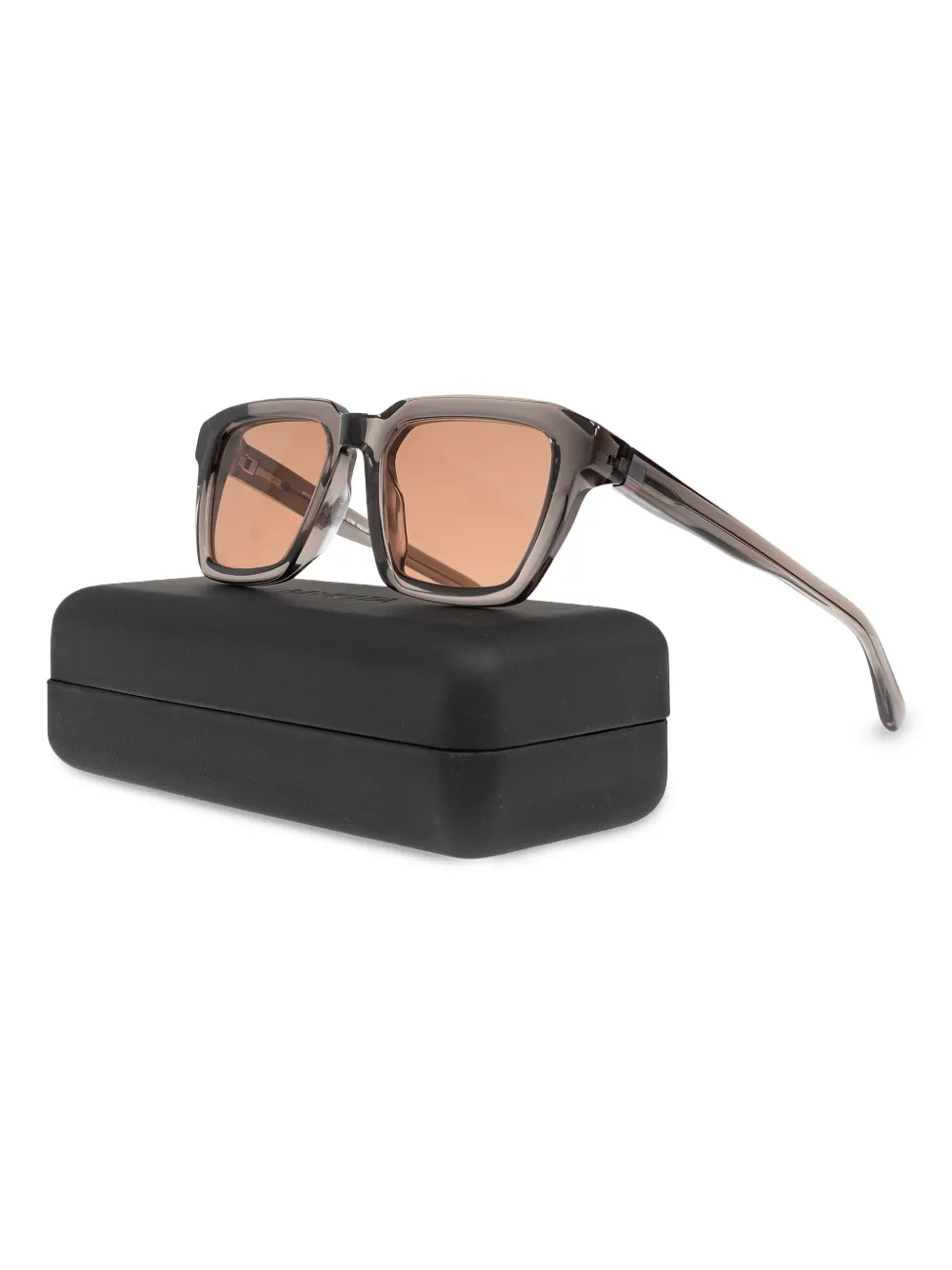 grijs gekleurde glazen dik montuur geometrische vorm opvallend design zijschilden