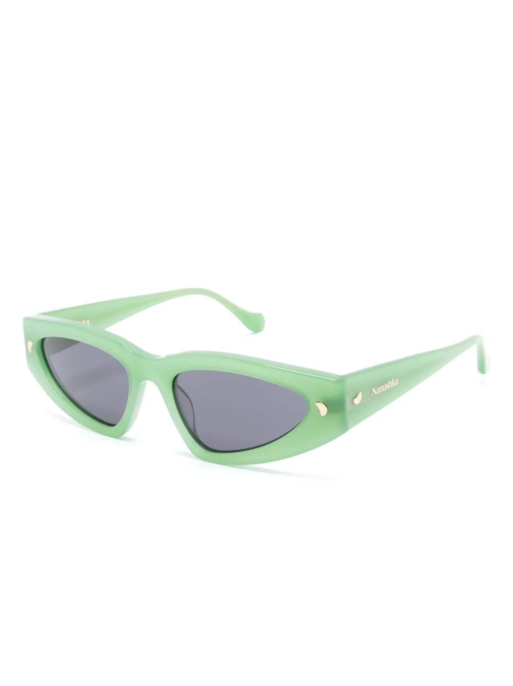 Lichtgroen, acetaat, logoprint op het pootje, goudkleurig materiaal, D-montuur, grijze glazen, rechte pootjes en gebogen uiteinde. Deze bril wordt verkocht met een beschermhoes.. . .