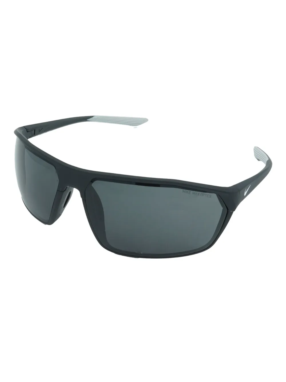 zwart shield montuur grijze glazen rechte pootjes Deze bril wordt verkocht met een beschermhoes.