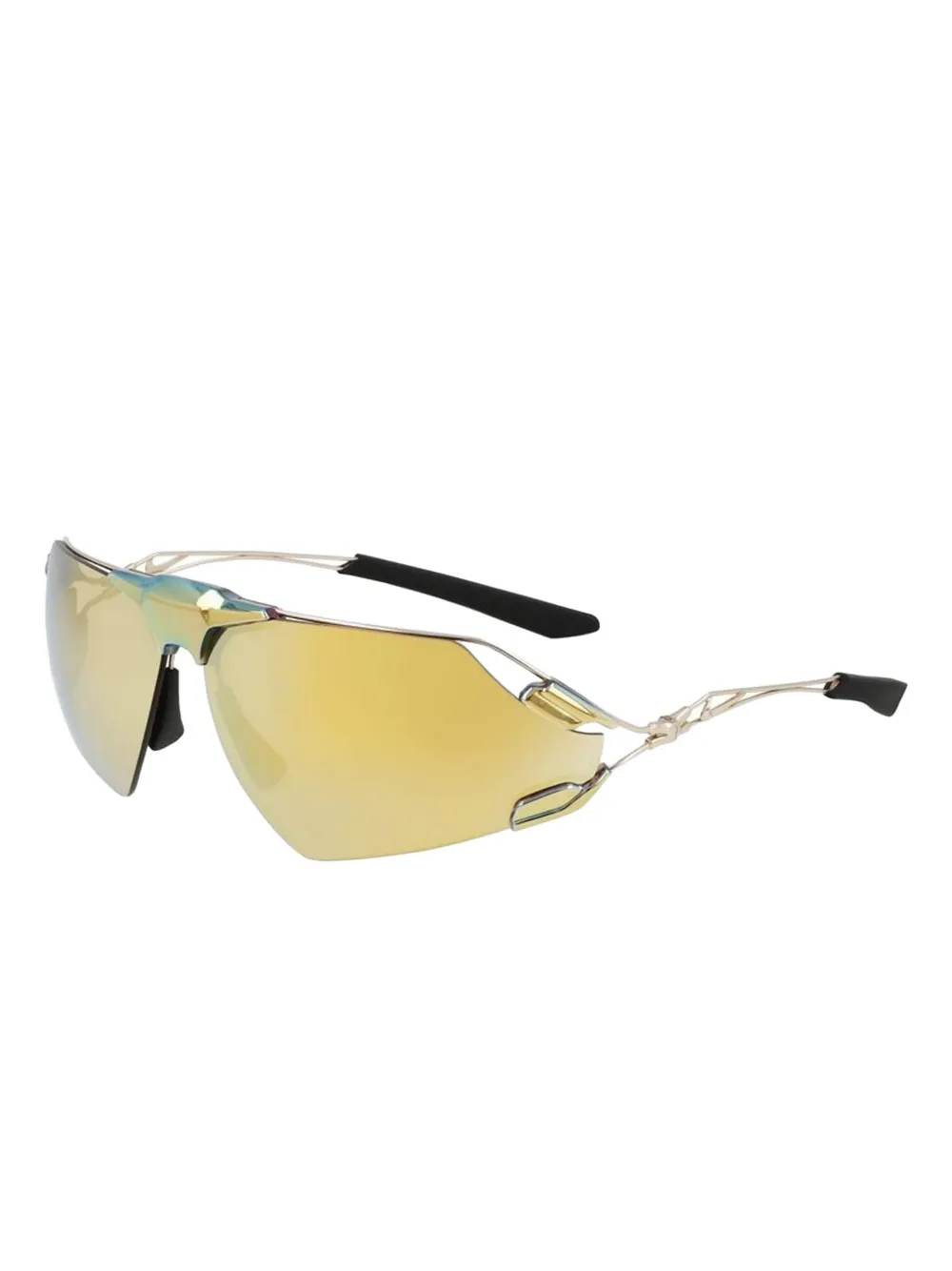 goudkleurig spiegelglazen shield montuur titanium pootjes neuskussentjes Deze bril wordt verkocht met een beschermhoes.
