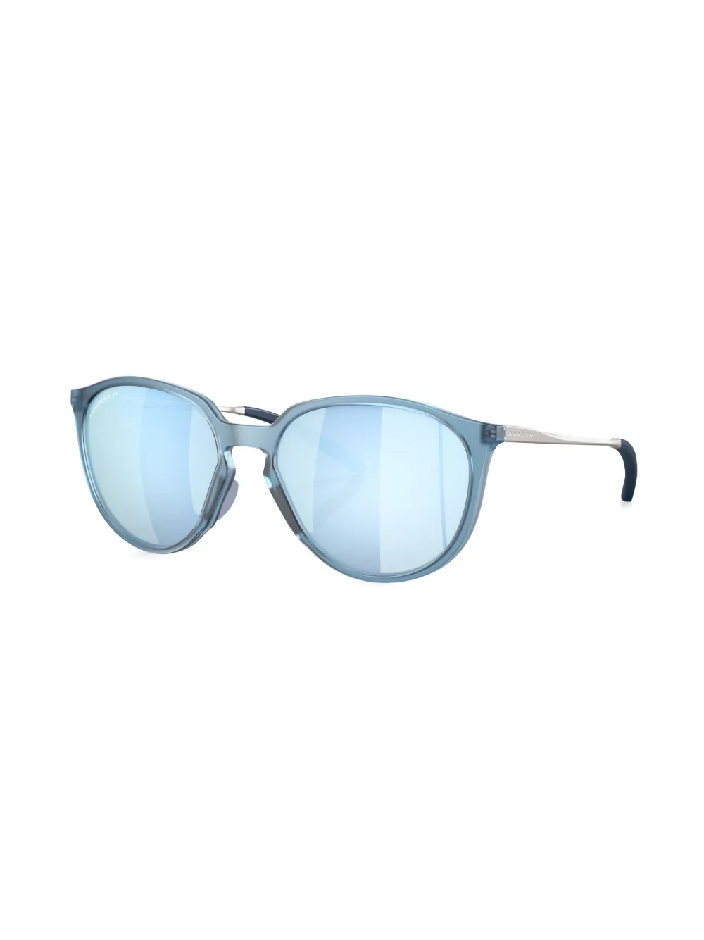 Lichtblauw, rond montuur, gespiegelde glazen, neuskussentjes, rechte pootjes en gebogen uiteinde. Deze bril wordt verkocht met een beschermhoes..