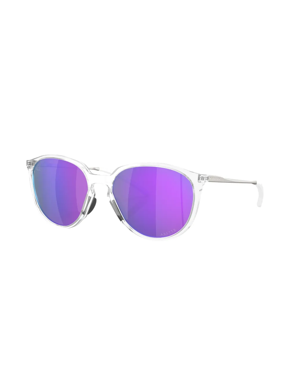 Ivoorwit, ovaal montuur, paarse glazen, rechte pootjes, gebogen uiteinde, pootje met gegraveerd logo en glazen met UV-bescherming. Deze bril wordt verkocht met een beschermhoes..