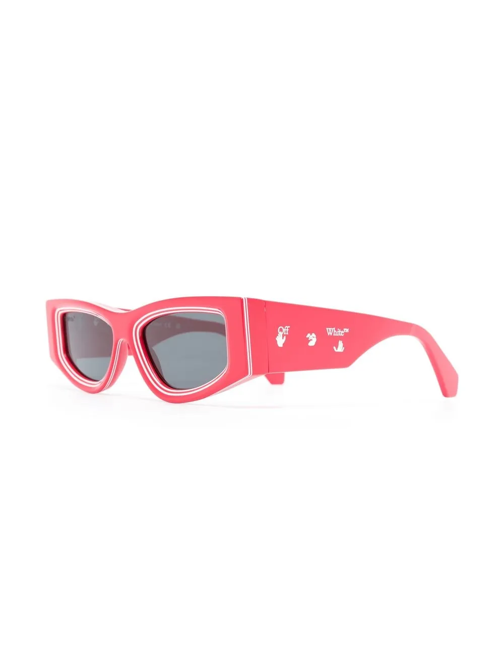 Klaproosrood, acetaat, grijze glazen, vierkant montuur, logoprint op het pootje en rechte pootjes. Deze bril wordt verkocht met een beschermhoes..