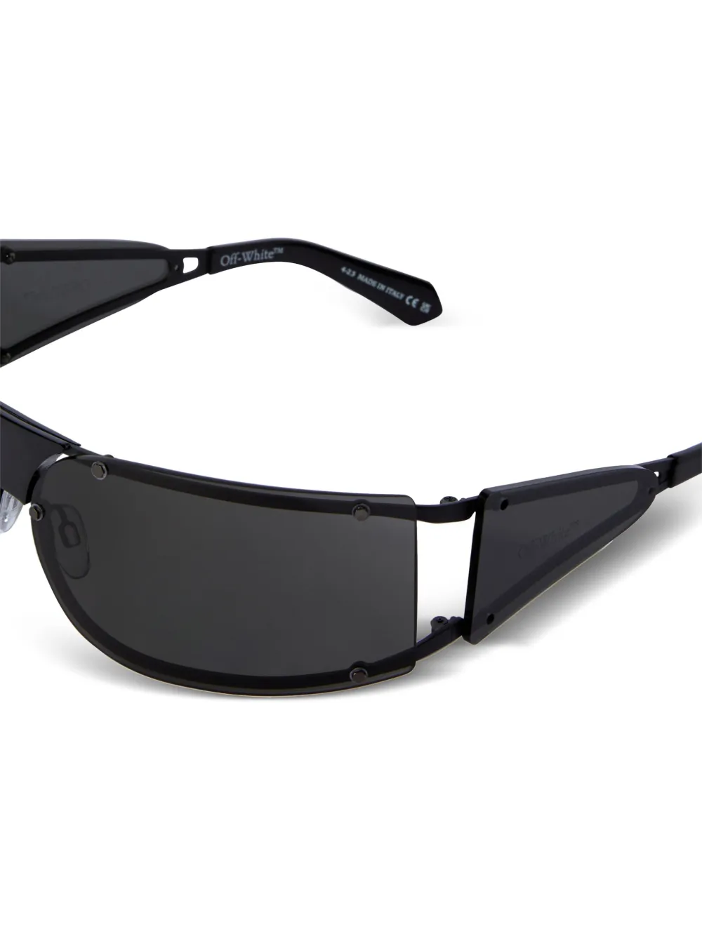 Zwart, acetaat, oversized montuur, pootje met gegraveerd logo, gebogen uiteinde en grijze glazen. Deze bril wordt verkocht met een beschermhoes..