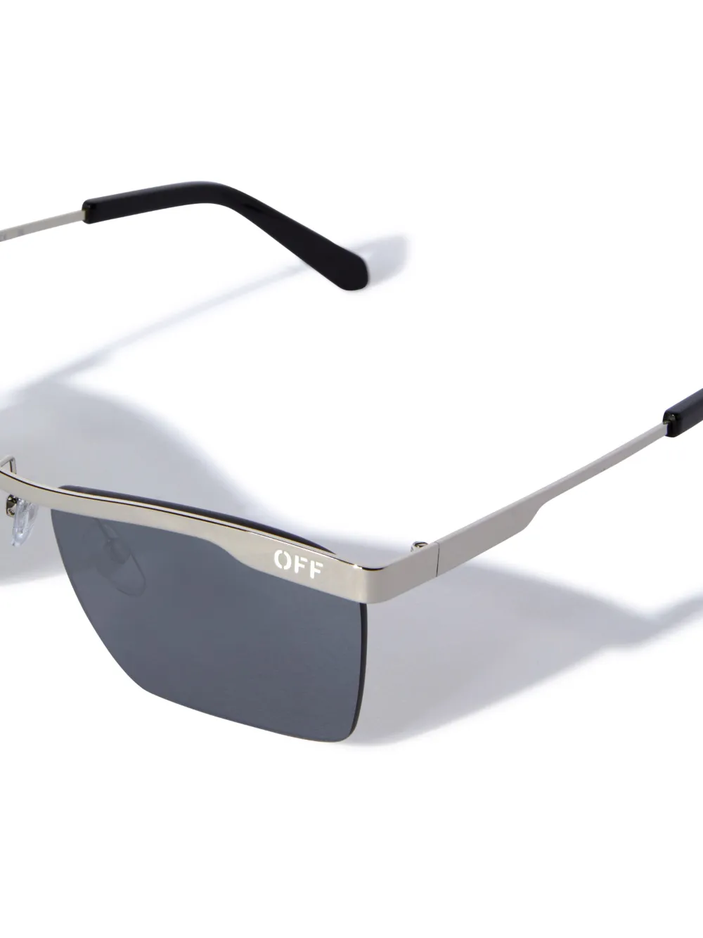 Zilverkleurig, metaal, rechthoekig montuur, blauwe glazen, logoprint op de voorkant, neuskussentjes en gebogen uiteinde. Deze bril wordt verkocht met een beschermhoes..