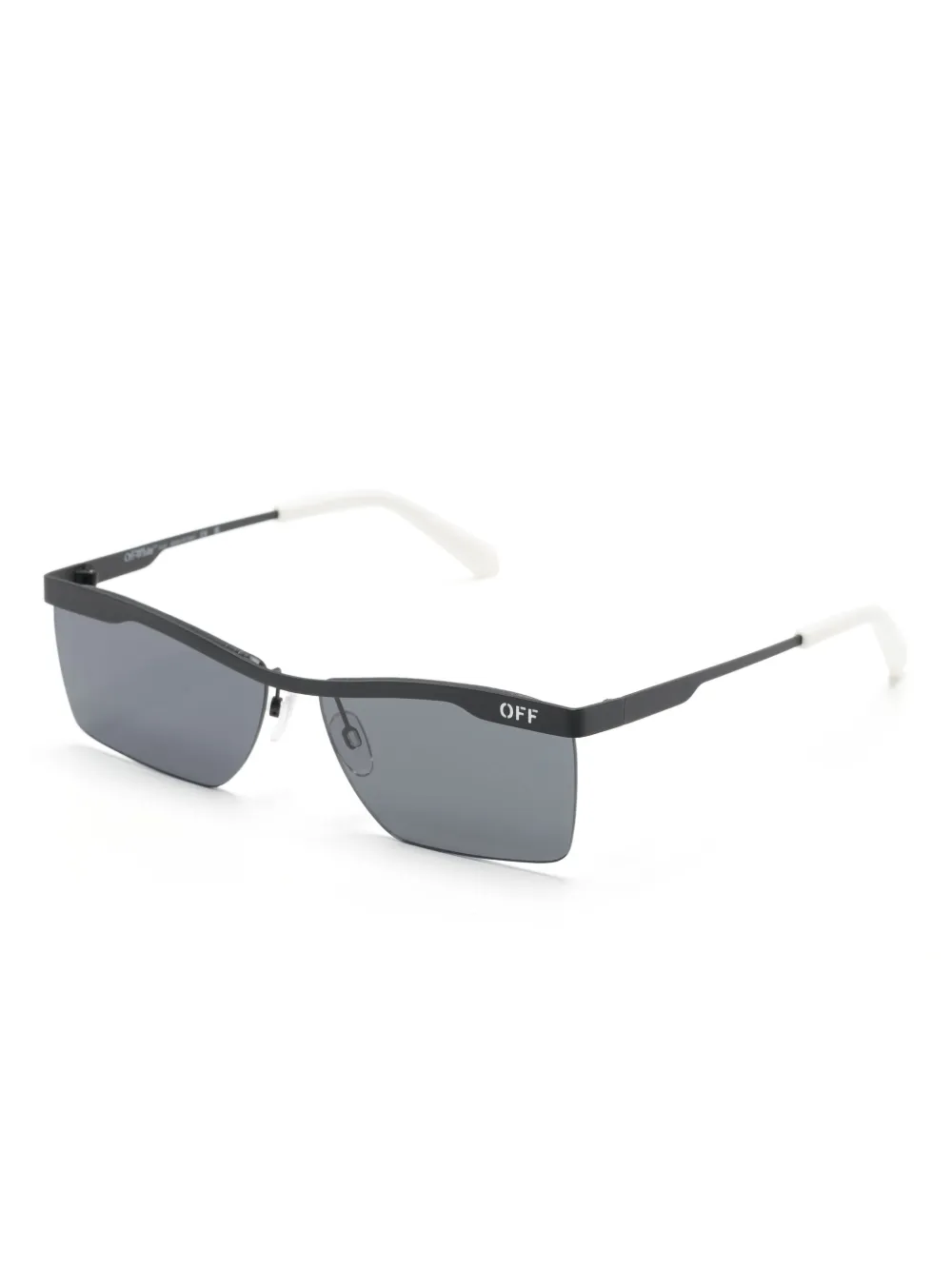 Zwart, acetaat, metaal, rechthoekig montuur, grijze glazen, logoprint op de voorkant, neuskussentjes en gebogen uiteinde. Deze bril wordt verkocht met een beschermhoes..