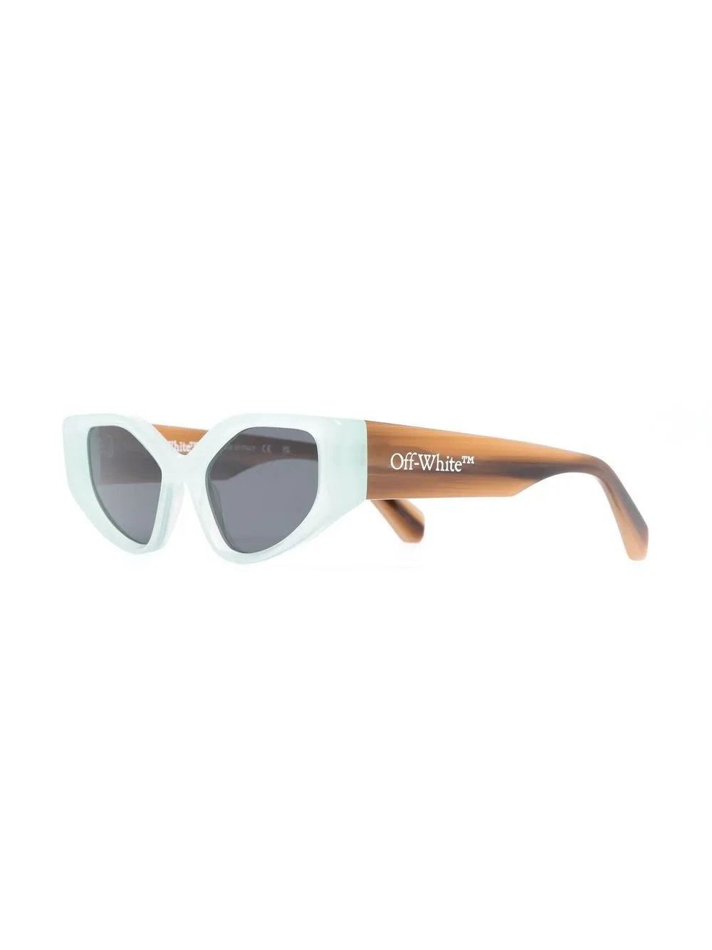 Acetaat, cat-eye montuur, gekleurde glazen, UV-bescherming, logoprint aan de zijkant en gebogen uiteinde. Deze bril wordt verkocht met een beschermhoes..