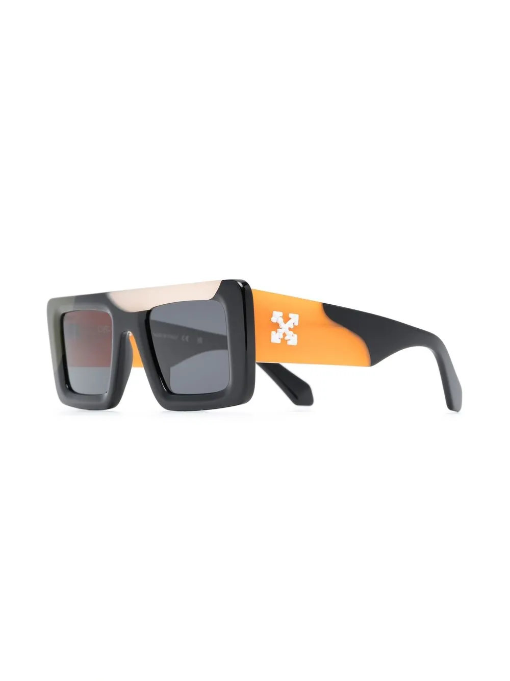 Zwart/veelkleurig, acetaat, kenmerkend Arrows patroon, grijze glazen, UV-bescherming en gebogen uiteinde. Deze bril wordt verkocht met een beschermhoes..
