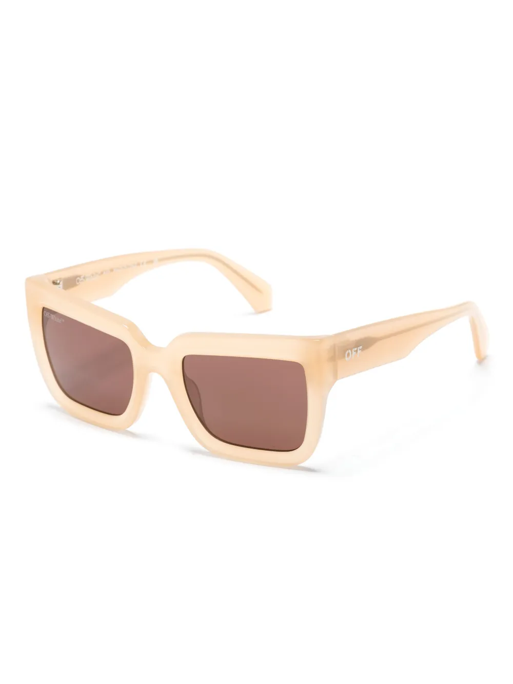 Zandbruin, acetaat, doorzichtig ontwerp, vierkant montuur, bruine glazen, lens sticker, pootje met logo-reliëf, rechte pootjes en gebogen uiteinde. Deze bril wordt verkocht met een beschermhoes..
