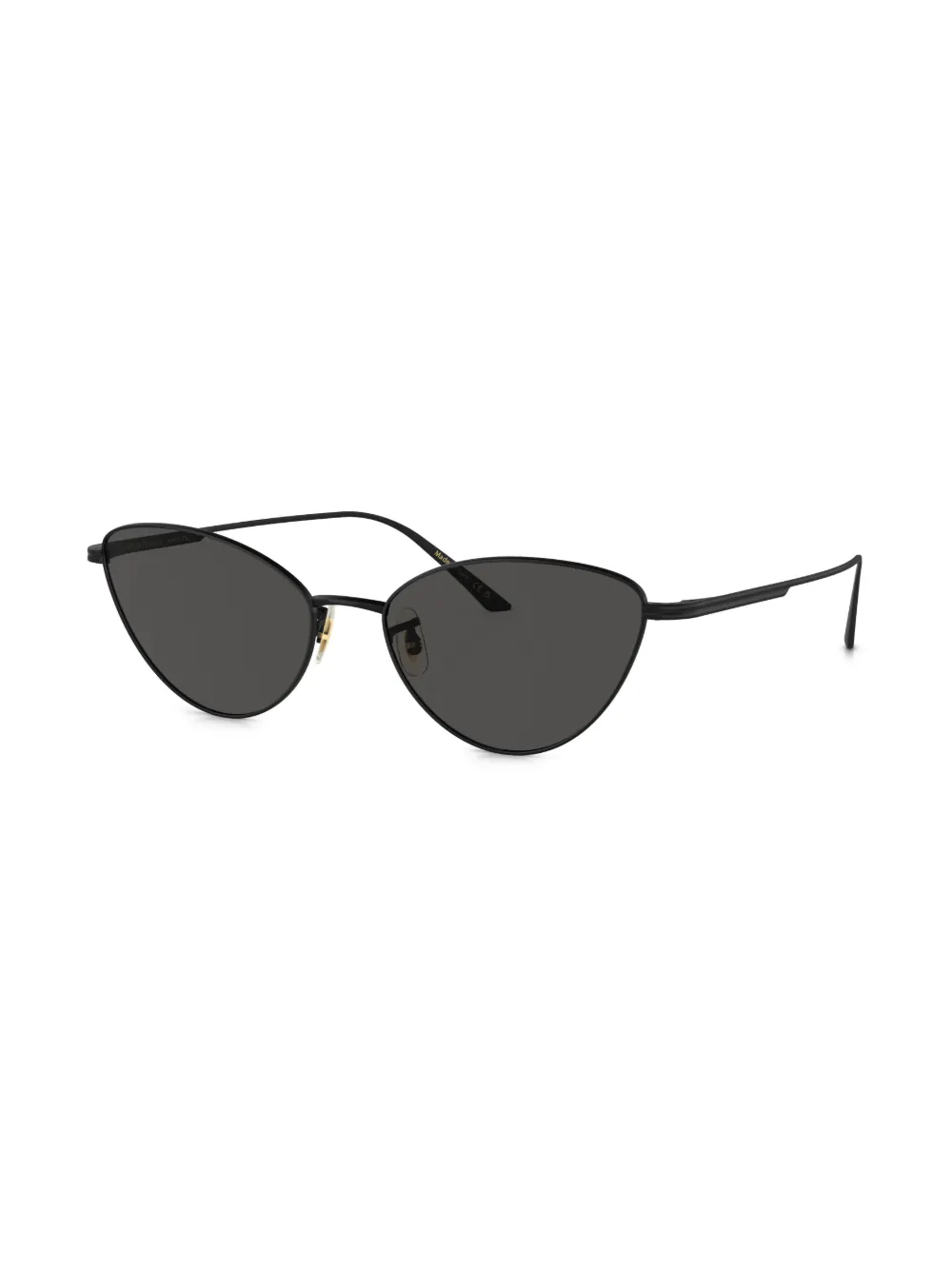 Zwart, metaal, cat-eye montuur, grijze glazen, neuskussentjes, rechte pootjes en gebogen uiteinde. Deze bril wordt verkocht met een beschermhoes..