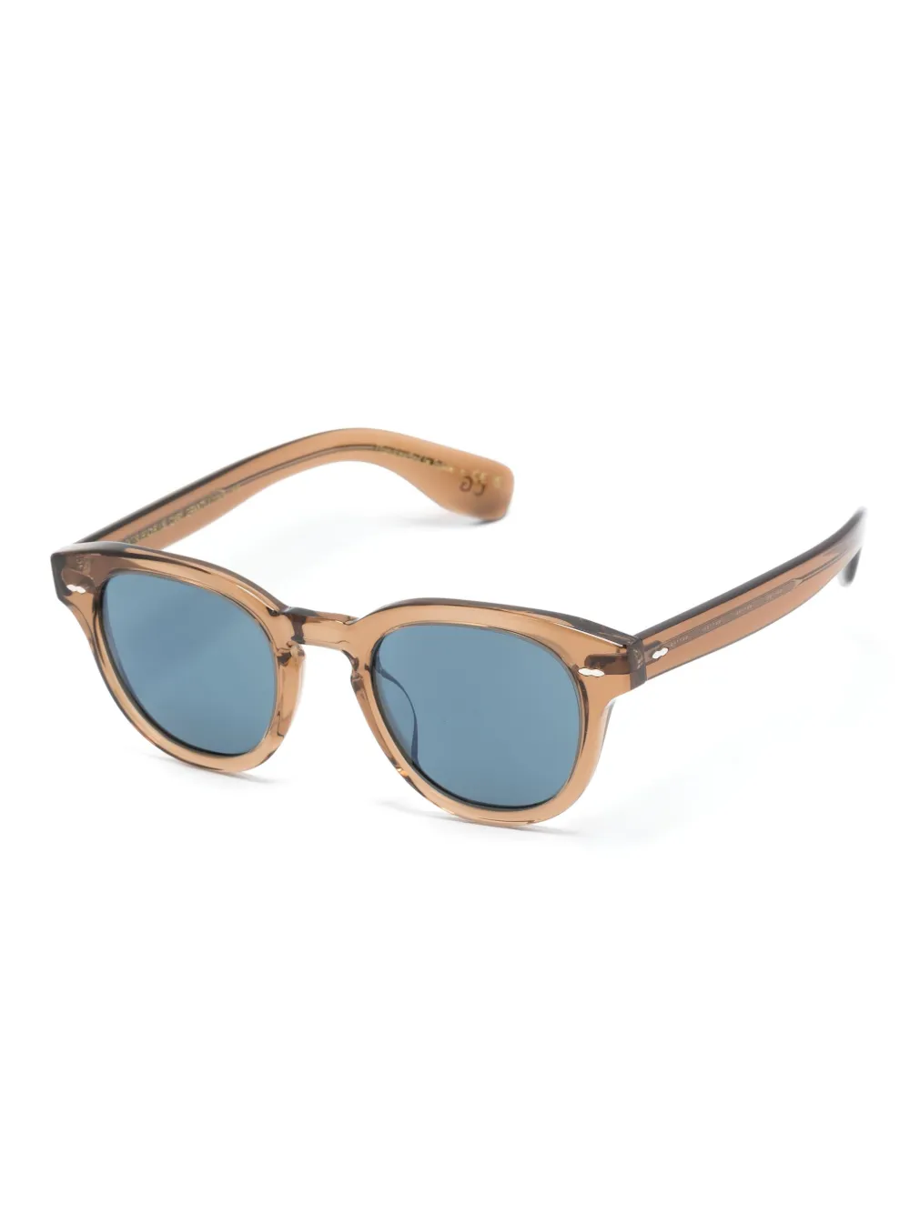lichtbruin acetaat doorzichtig design rond montuur grijze glazen rechte pootjes gebogen uiteinden Deze bril wordt verkocht met een beschermhoes.