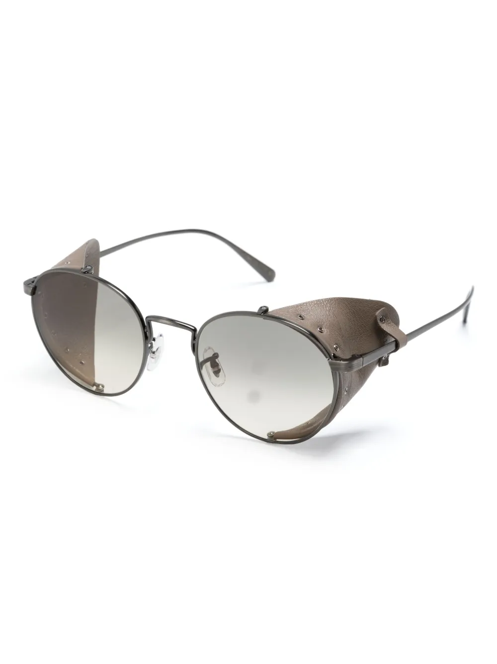 Brons, metaal, grijze glazen, glazen met kleurverloop, shield montuur, neuskussentjes, rechte pootjes en gebogen uiteinde. Deze bril wordt verkocht met een beschermhoes..