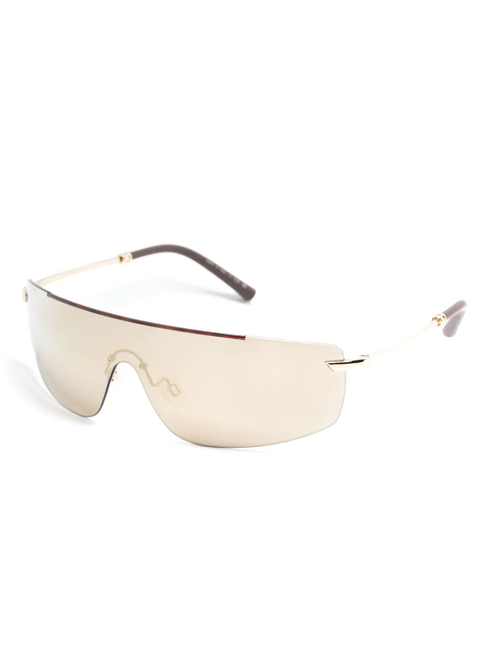 goudkleurig bruinrood biker montuur glazen met UV-bescherming gespiegelde glazen randloze glazen lens sticker neuskussentjes rechte pootjes gebogen uiteinden Deze bril wordt verkocht met een beschermhoes.