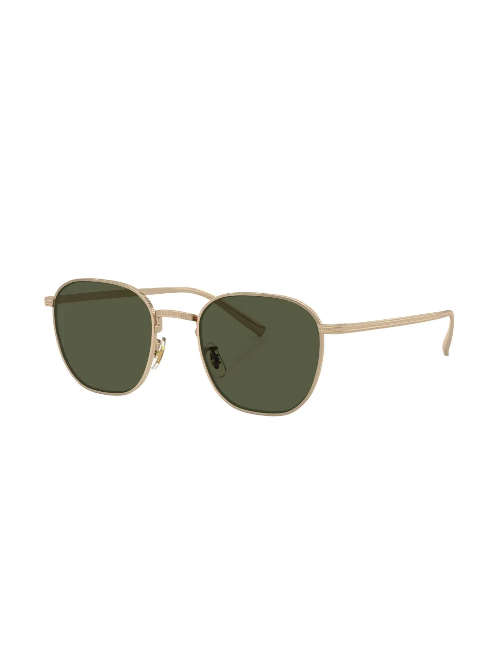 Goudkleurig, titanium, vierkant montuur, groengetinte glazen, neuskussentjes, rechte pootjes en gebogen uiteinde. Deze bril wordt verkocht met een beschermhoes..