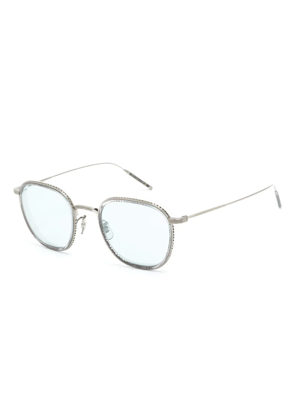 Zilver, titanium, acetaat, blauwe glazen, vierkant montuur, rechte pootjes en gebogen uiteinde. Deze bril wordt verkocht met een beschermhoes..